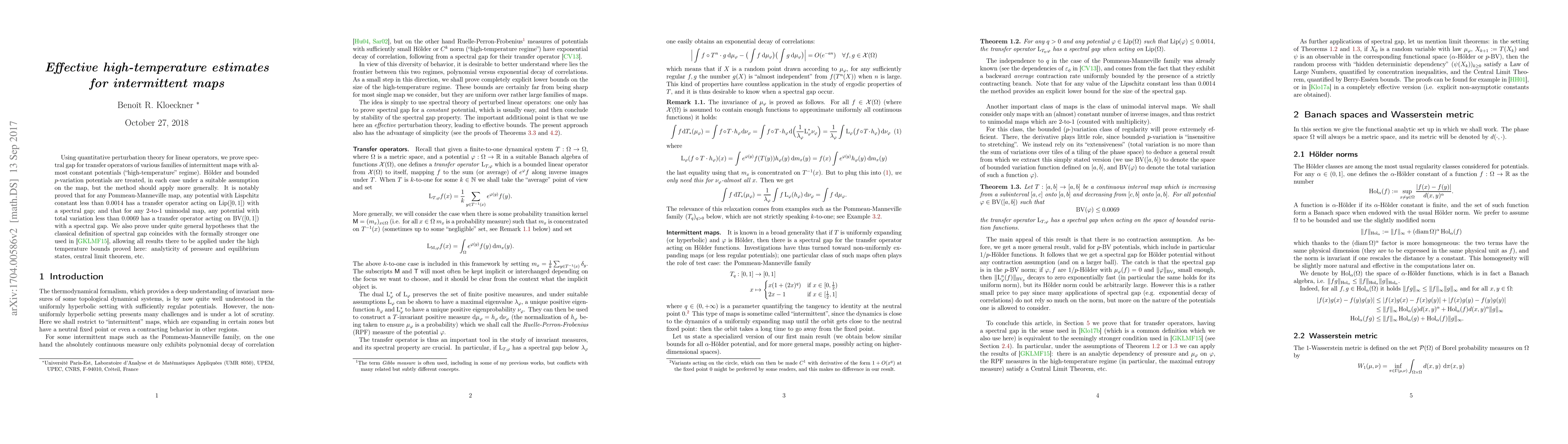 Using quantitative perturbation theory for linear operators, we prove spectral gap for transfer operators of various families of intermittent maps with almost constant potentials ("high-temperature" regime). H\"older and bounded p-variation potentials are treated, in each case under a suitable assumption on the map, but the method should apply more generally. It is notably proved that for any Pommeau-Manneville map, any potential with Lispchitz constant less than 0.0014 has a transfer operator acting on Lip([0, 1]) with a spectral gap; and that for any 2-to-1 unimodal map, any potential with total variation less than 0.0069 has a transfer operator acting on BV([0, 1]) with a spectral gap. We also prove under quite general hypotheses that the classical definition of spectral gap coincides with the formally stronger one used in (Giulietti et al. 2015), allowing all results there to be applied under the high temperature bounds proved here: analyticity of pressure and equilibrium states, central limit theorem, etc.