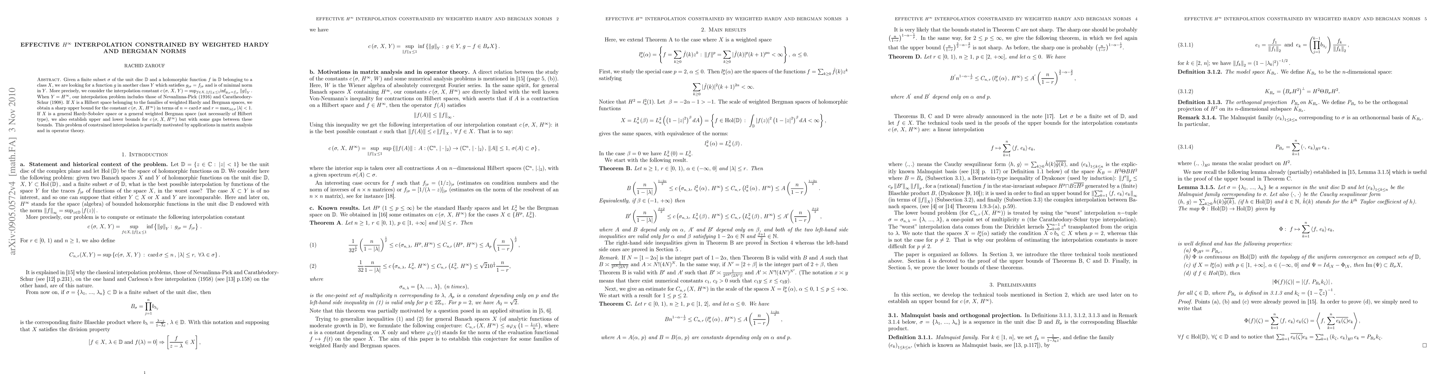 Given a finite set $\sigma$ of the unit disc $\mathbb{D}$ and a holomorphic function $f$ in $\mathbb{D}$ which belongs to a class $X$ we are looking for a function $g$ in another class $Y$ which minimizes the norm $|g|_{Y}$ among all functions $g$ such that $g_{|\sigma}=f_{|\sigma}$. Generally speaking, the interpolation constant considered is $c(\sigma,\, X,\, Y)={sup}{}_{f\in X,\,\parallel f\parallel_{X}\leq1}{inf}\{|g|_{Y}:\, g_{|\sigma}=f_{|\sigma}\} \,.$ When $Y=H^{\infty}$, our interpolation problem includes those of Nevanlinna-Pick (1916), Caratheodory-Schur (1908). Moreover, Carleson's free interpolation (1958) has also an interpretation in terms of our constant $c(\sigma,\, X,\, H^{\infty})$.} If $X$ is a Hilbert space belonging to the scale of Hardy and Bergman weighted spaces, we show that $c(\sigma,\, X,\, H^{\infty})\leq a\phi_{X}(1-\frac{1-r}{n})$ where $n=#\sigma$, $r={max}{}_{\lambda\in\sigma}|\lambda|$ and where $\phi_{X}(t)$ stands for the norm of the evaluation functional $f\mapsto f(t)$ on the space $X$. The upper bound is sharp over sets $\sigma$ with given $n$ and $r$.} If $X$ is a general Hardy-Sobolev space or a general weighted Bergman space (not necessarily of Hilbert type), we also found upper and lower bounds for $c(\sigma,\, X,\, H^{\infty})$ (sometimes for special sets $\sigma$) but with some gaps between these bounds.} This constrained interpolation is motivated by some applications in matrix analysis and in operator theory.}