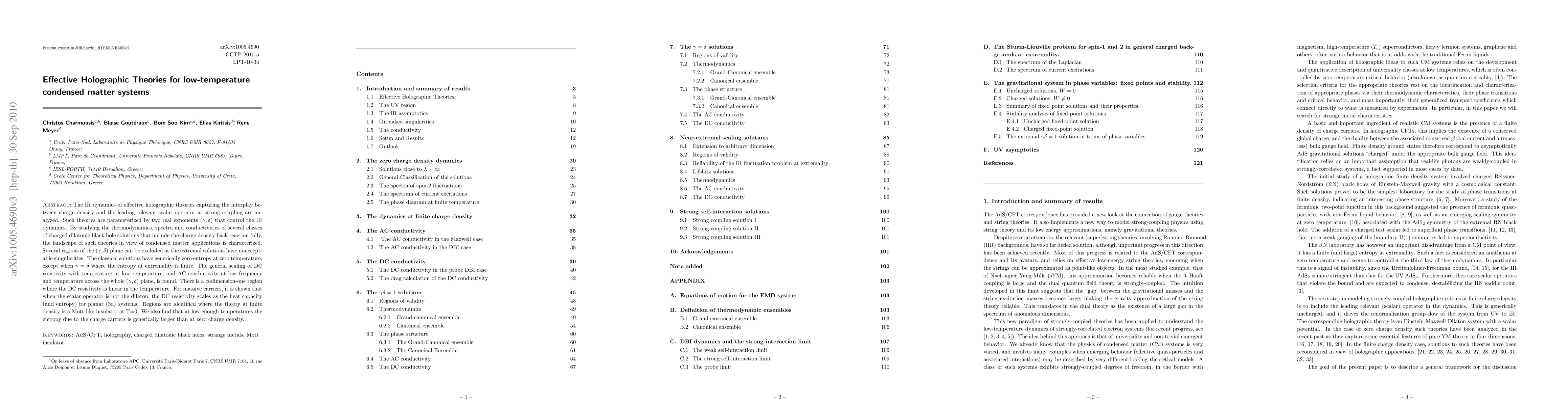 This paper analyzes effective holographic theories for low-temperature condensed matter systems, focusing on the interplay between charge density and scalar operators. The study identifies regions in the $(\gamma,\delta)$ parameter space that are viable for condensed matter applications, revealing a codimension-one region where DC resistivity is linear in temperature and characterizing the entropy and conductivity scaling laws.