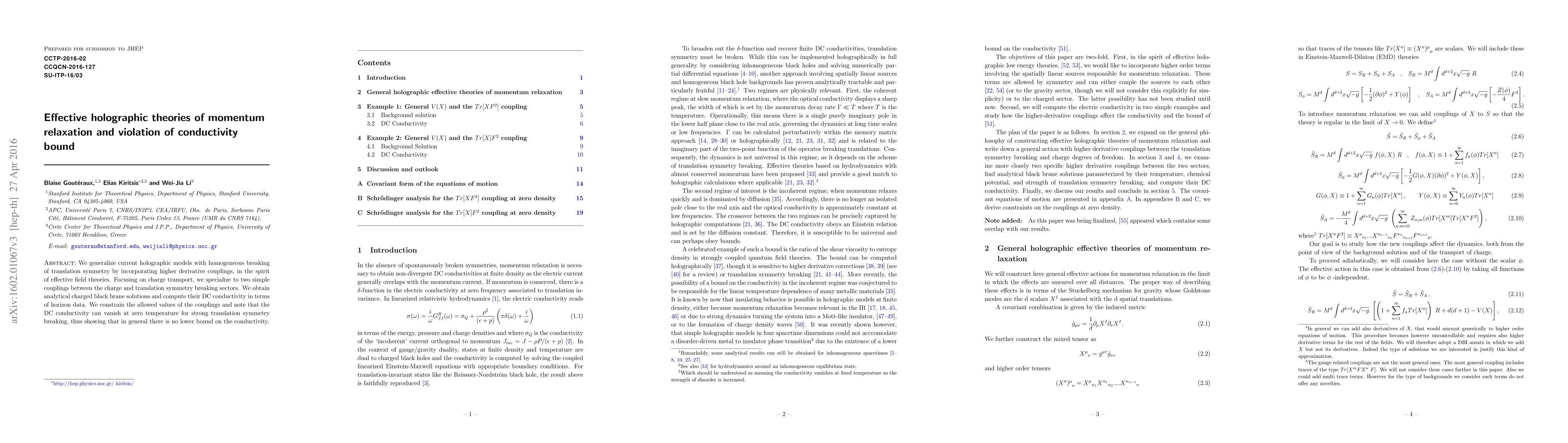 Researchers developed new holographic theories to study momentum relaxation and conductivity in exotic materials, finding that zero-temperature conductivity can vanish for strong symmetry breaking.