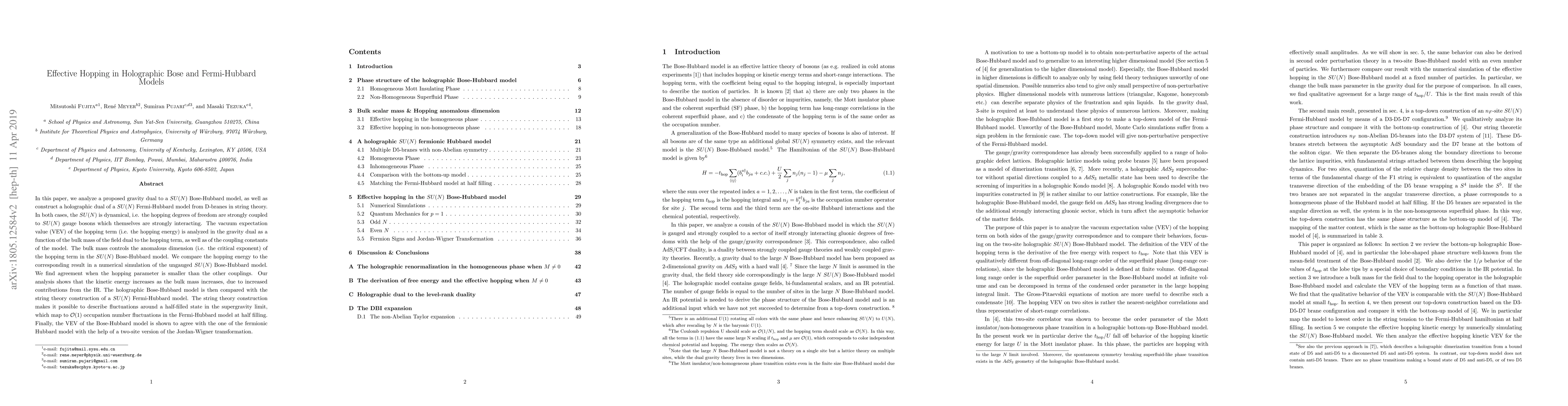 This paper constructs holographic duals of $SU(N)$ Bose- and Fermi-Hubbard models using gravity and string theory, respectively, and analyzes the hopping energy in these models. It finds agreement between the holographic results and numerical simulations for the Bose-Hubbard model, and uses string theory to describe fluctuations in the Fermi-Hubbard model.
