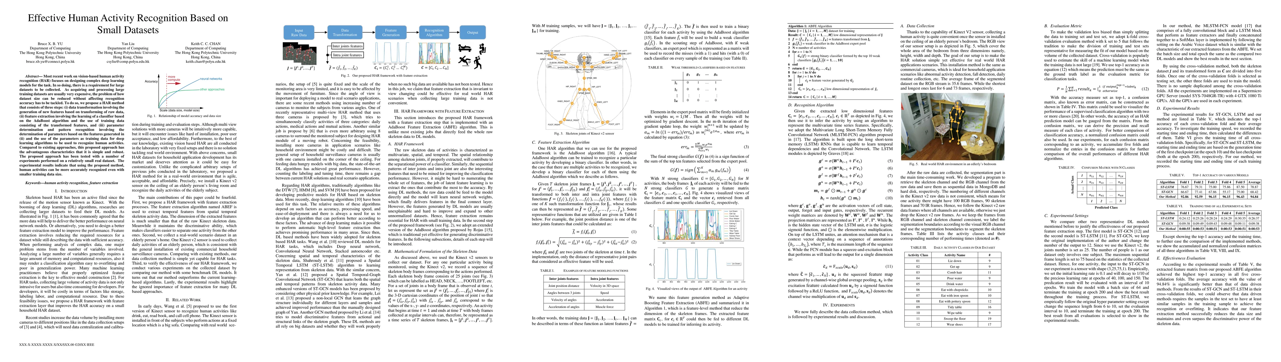 Most recent work on vision-based human activity recognition (HAR) focuses on designing complex deep learning models for the task. In so doing, there is a requirement for large datasets to be collected. As acquiring and processing large training datasets are usually very expensive, the problem of how dataset size can be reduced without affecting recognition accuracy has to be tackled. To do so, we propose a HAR method that consists of three steps: (i) data transformation involving the generation of new features based on transforming of raw data, (ii) feature extraction involving the learning of a classifier based on the AdaBoost algorithm and the use of training data consisting of the transformed features, and (iii) parameter determination and pattern recognition involving the determination of parameters based on the features generated in (ii) and the use of the parameters as training data for deep learning algorithms to be used to recognize human activities. Compared to existing approaches, this proposed approach has the advantageous characteristics that it is simple and robust. The proposed approach has been tested with a number of experiments performed on a relatively small real dataset. The experimental results indicate that using the proposed method, human activities can be more accurately recognized even with smaller training data size.