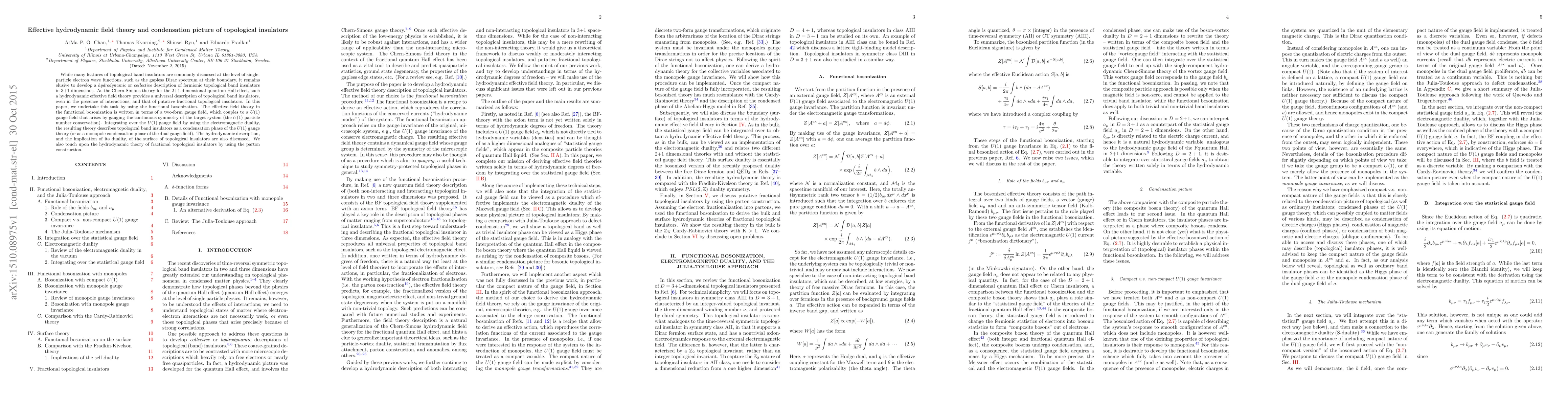This paper develops a hydrodynamic effective field theory for fermionic topological band insulators in 3+1 dimensions using functional bosonization. It introduces a two-form gauge field describing topological insulators as a $U(1)$ gauge theory condensation phase, paralleling the Chern-Simons theory for the quantum Hall effect.