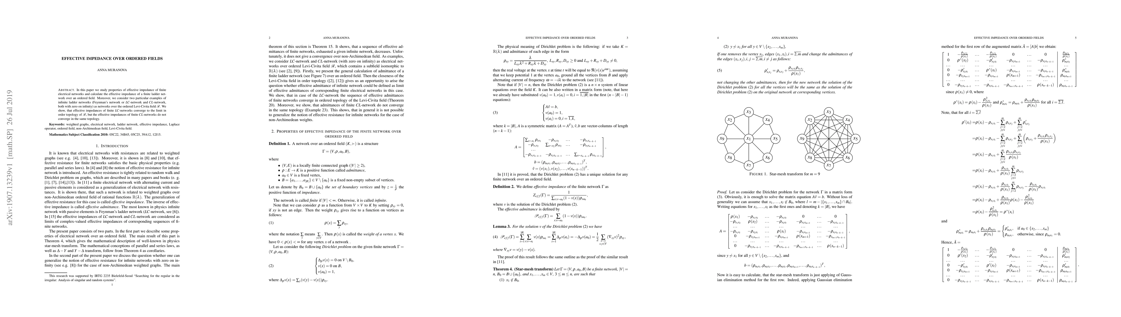 In this paper, we study properties of effective impedance of finite electrical networks and calculate the effective impedance of a finite ladder network over an ordered field. Moreover, we consider two particular examples of infinite ladder networks (Feynman's network or LC-network and CL-network, both with zero on infinity) as networks over the ordered Levi-Civita field. We show, that effective impedances of finite LC-networks converge to the limit in order topology of Levi-Civita field, but the effective impedances of finite CL-networks do not converge in the same topology.