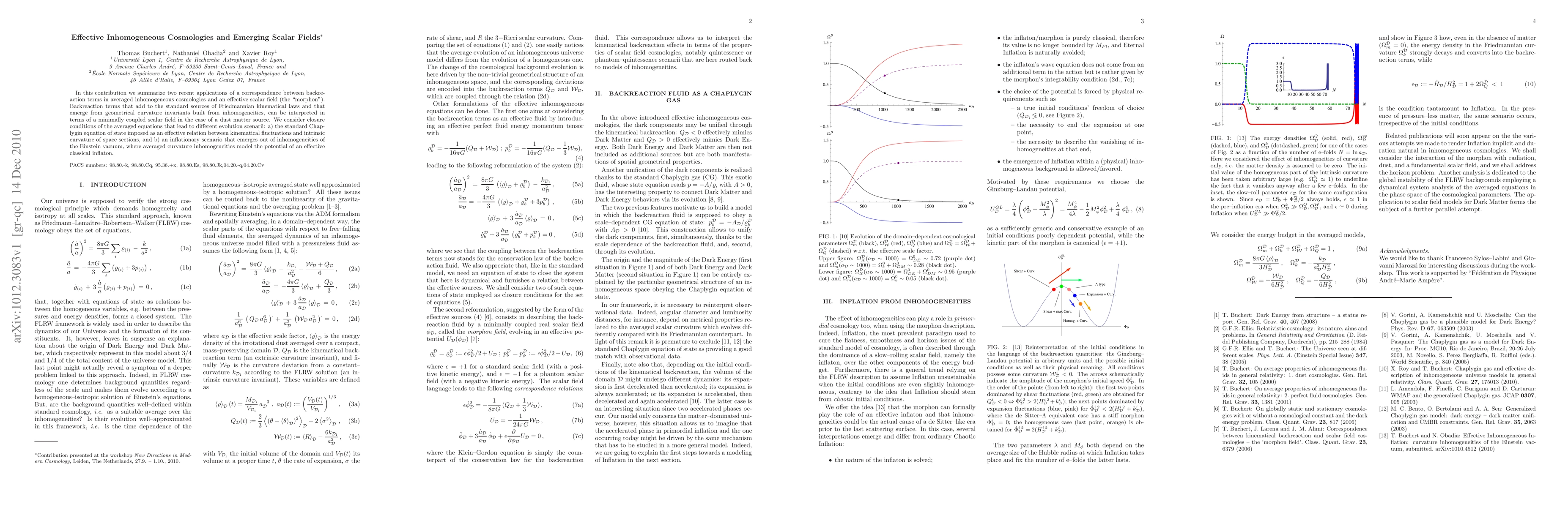 In this contribution we summarize two recent applications of a correspondence between backreaction terms in averaged inhomogeneous cosmologies and an effective scalar field (the `morphon'). Backreaction terms that add to the standard sources of Friedmannian kinematical laws and that emerge from geometrical curvature invariants built from inhomogeneities, can be interpreted in terms of a minimally coupled scalar field in the case of a dust matter source. We consider closure conditions of the averaged equations that lead to different evolution scenarii: a) the standard Chaplygin equation of state imposed as an effective relation between kinematical fluctuations and intrinsic curvature of space sections, and b) an inflationary scenario that emerges out of inhomogeneities of the Einstein vacuum, where averaged curvature inhomogeneities model the potential of an effective classical inflaton.