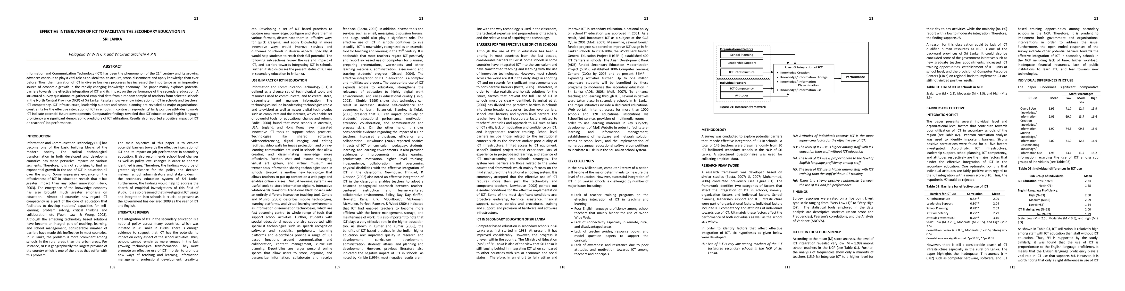This paper investigates barriers to ICT integration in Sri Lankan secondary education, finding low ICT competency and infrastructure, along with lack of leadership support as major constraints. Despite these, teachers show positive attitudes towards ICT, suggesting future improvements, with ICT education and English proficiency influencing its utilization, and a noted positive impact on teacher job performance.