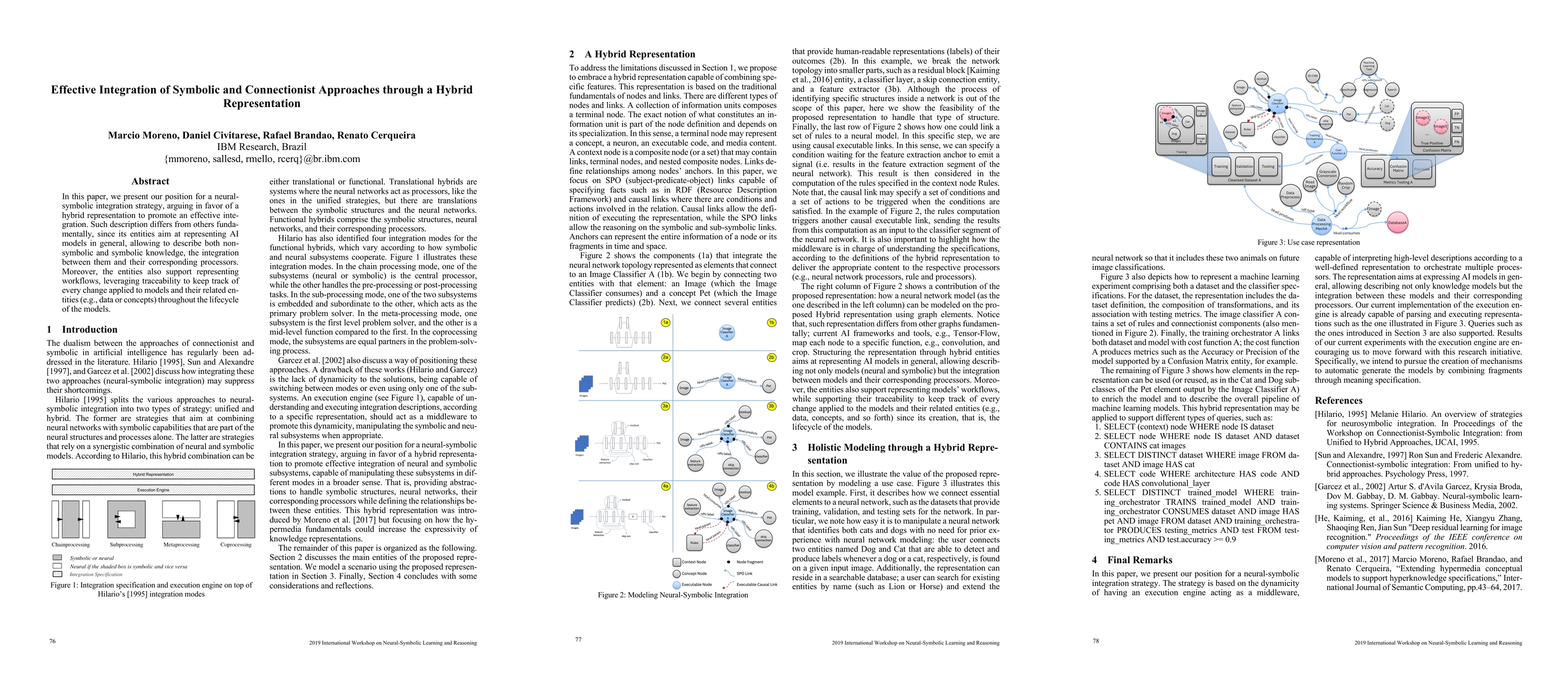 In this paper, we present our position for a neuralsymbolic integration strategy, arguing in favor of a hybrid representation to promote an effective integration. Such description differs from others fundamentally, since its entities aim at representing AI models in general, allowing to describe both nonsymbolic and symbolic knowledge, the integration between them and their corresponding processors. Moreover, the entities also support representing workflows, leveraging traceability to keep track of every change applied to models and their related entities (e.g., data or concepts) throughout the lifecycle of the models.