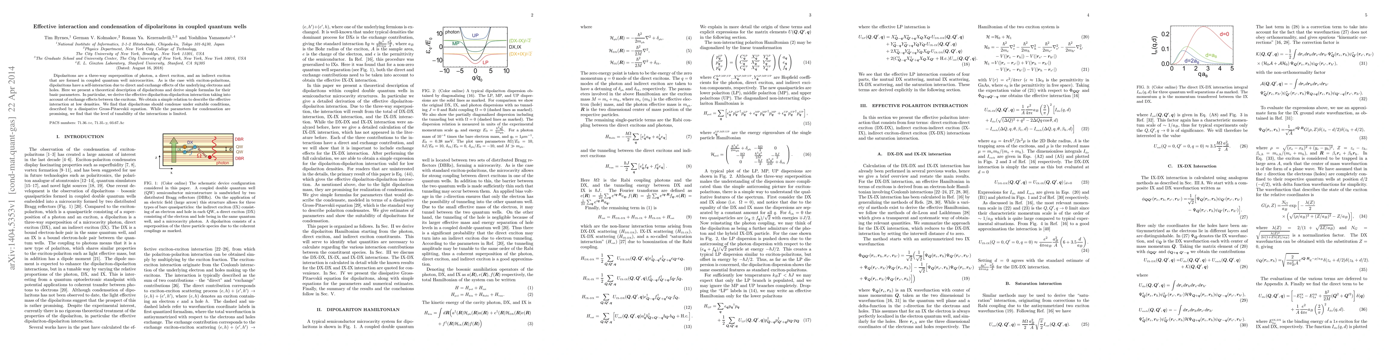 This paper presents a theoretical framework for the interaction and condensation of dipolaritons in coupled quantum wells, deriving formulas for their effective interaction and showing that they can condense under specific conditions, though with limited tunability. The study employs a dissipative Gross-Pitaevskii equation to describe the condensation process.