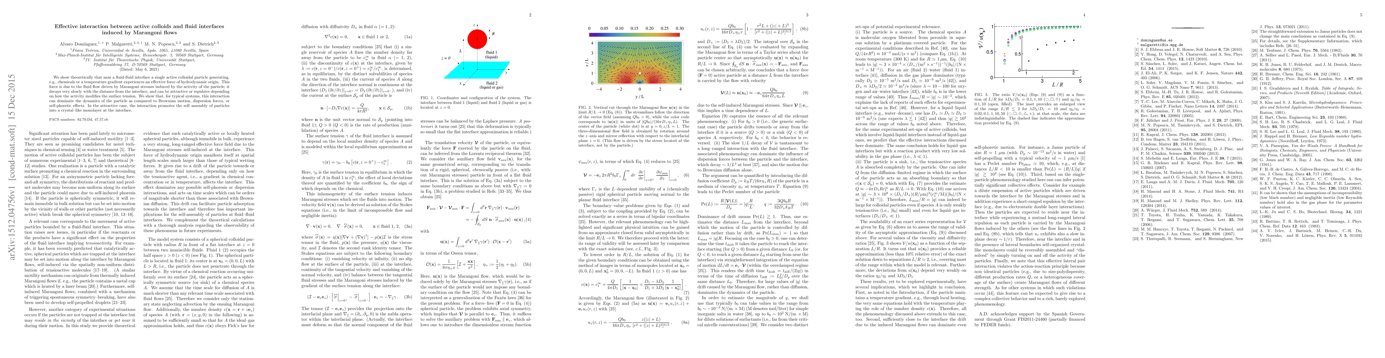The paper presents a theoretical study revealing that a single active colloidal particle near a fluid-fluid interface experiences a hydrodynamic force due to Marangoni stress-induced fluid flows. This force, which can be attractive or repulsive, dominates over Brownian motion, dispersion forces, and self-phoretic effects in typical systems, leading to self-assembly of particles into a crystal-like monolayer at the interface in the attractive case.