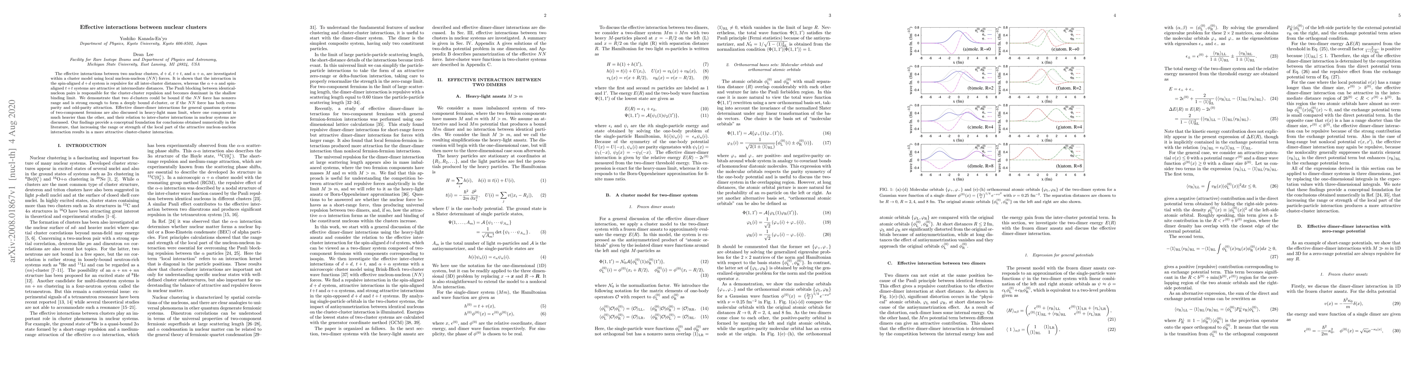 The effective interactions between two nuclear clusters, $d+d$, $t+t$, and $\alpha+\alpha$, are investigated within a cluster model using local nucleon-nucleon~($NN$) forces. It is shown that the interaction in the spin-aligned $d+d$ system is repulsive for all inter-cluster distances, whereas the $\alpha+\alpha$ and spin-aligned $t+t$ systems are attractive at intermediate distances. The Pauli blocking between identical-nucleon pairs is responsible for the cluster-cluster repulsion and becomes dominant in the shallow binding limit. We demonstrate that two $d$-clusters could be bound if the $NN$ force has nonzero range and is strong enough to form a deeply bound $d$-cluster, or if the $NN$ force has both even-parity and odd-parity attraction. Effective dimer-dimer interactions for general quantum systems of two-component fermions are also discussed in heavy-light mass limit, where one component is much heavier than the other, and their relation to inter-cluster interactions in nuclear systems are discussed. Our findings provide a conceptual foundation for conclusions obtained numerically in the literature, that increasing the range or strength of the local part of the attractive nucleon-nucleon interaction results in a more attractive cluster-cluster interaction.