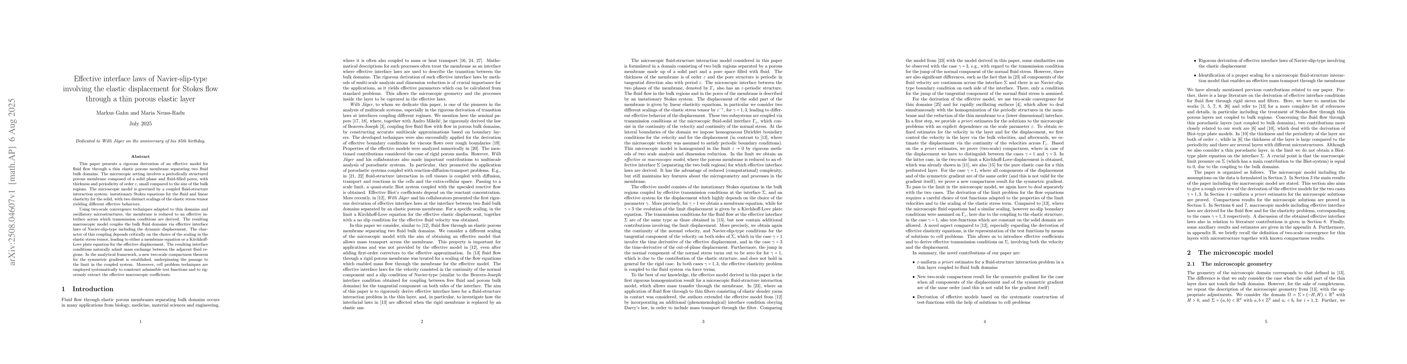 This paper presents a rigorous derivation of an effective model for fluid flow through a thin elastic porous membrane separating two fluid bulk domains. The microscopic setting involves a periodically structured porous membrane composed of a solid phase and fluid-filled pores, with thickness and periodicity of order $\varepsilon$, small compared to the size of the bulk regions. The microscopic model is governed by a coupled fluid-structure interaction system: instationary Stokes equations for the fluid and linear elasticity for the solid, with two distinct scalings of the elastic stress tensor yielding different effective behaviors. Using two-scale convergence techniques adapted to thin domains and oscillatory microstructures, the membrane is reduced to an effective interface across which transmission conditions are derived. The resulting macroscopic model couples the bulk fluid domains via effective interface laws of Navier-slip-type including the dynamic displacement. The character of this coupling depends critically on the choice of the scaling in the elastic stress tensor, leading to either a membrane equation or a Kirchhoff-Love plate equation for the effective displacement. The resulting interface conditions naturally admit mass exchange between the adjacent fluid regions. In the analytical framework, a new two-scale compactness theorem for the symmetric gradient is established, underpinning the passage to the limit in the coupled system. Moreover, cell problem techniques are employed systematically to construct admissible test functions and to rigorously extract the effective macroscopic coefficients.