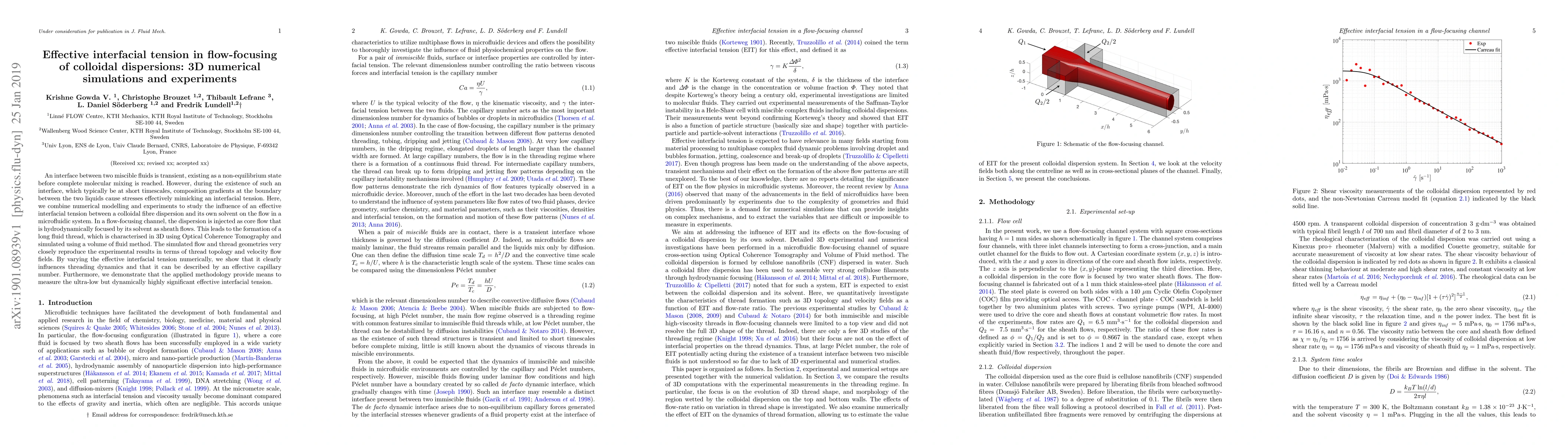 An interface between two miscible fluids is transient, existing as a non-equilibrium state before complete molecular mixing is reached. However, during the existence of such an interface, which typically be at short timescales, composition gradients at the boundary between the two liquids cause stresses effectively mimicking an interfacial tension. Here, we combine numerical modelling and experiments to study the influence of an effective interfacial tension between a colloidal fibre dispersion and its own solvent on the flow in a microfluidic system. In a flow-focusing channel, the dispersion is injected as core flow that is hydrodynamically focused by its solvent as sheath flows. This leads to the formation of a long fluid thread, which is characterised in 3D using Optical Coherence Tomography and simulated using a volume of fluid method. The simulated flow and thread geometries very closely reproduce the experimental results in terms of thread topology and velocity flow fields. By varying the effective interfacial tension numerically, we show that it clearly influences threading dynamics and that it can be described by an effective capillary number. Furthermore, we demonstrate that the applied methodology provide means to measure the ultra-low but dynamically highly significant effective interfacial tension.