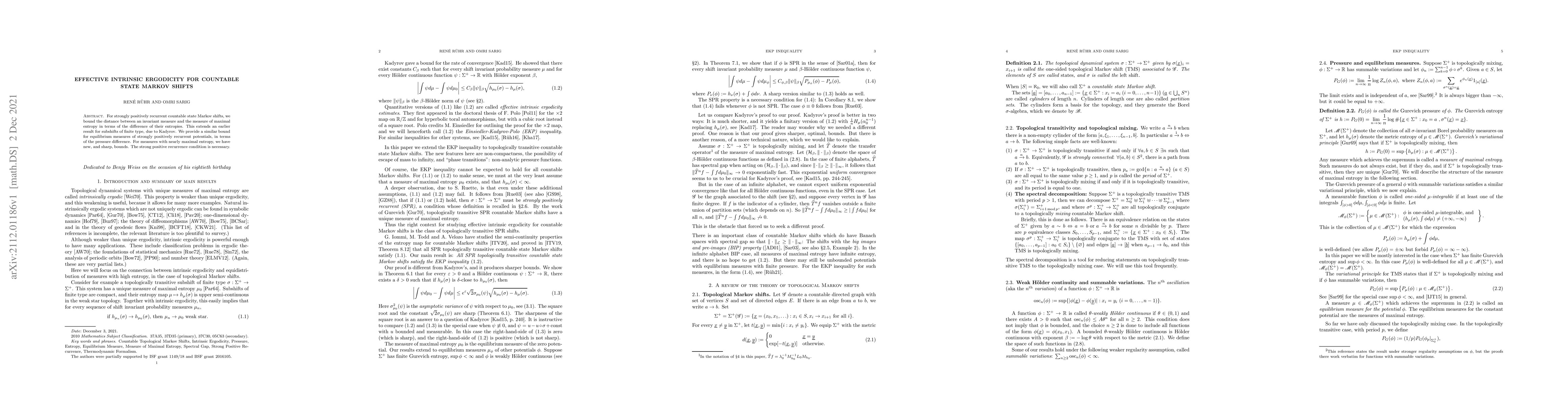 For strongly positively recurrent countable state Markov shifts, we bound the distance between an invariant measure and the measure of maximal entropy in terms of the difference of their entropies. This extends an earlier result for subshifts of finite type, due to Kadyrov. We provide a similar bound for equilibrium measures of strongly positively recurrent potentials, in terms of the pressure difference. For measures with nearly maximal entropy, we have new, and sharp, bounds. The strong positive recurrence condition is necessary.