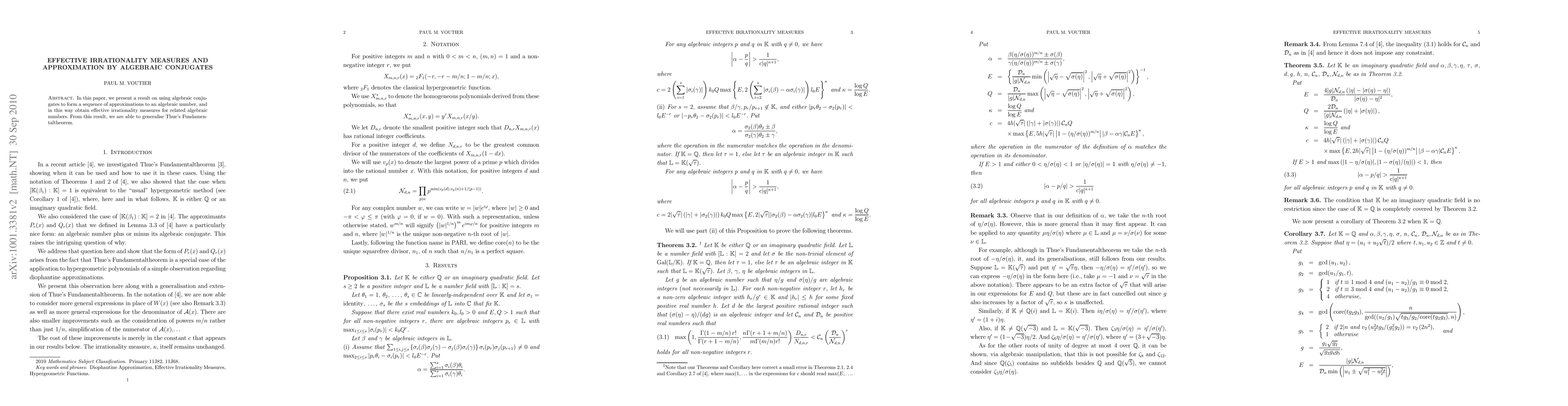 This paper explores the use of algebraic conjugates to approximate algebraic numbers, leading to effective irrationality measures for related numbers, and extends Thue's Fundamental Theorem.