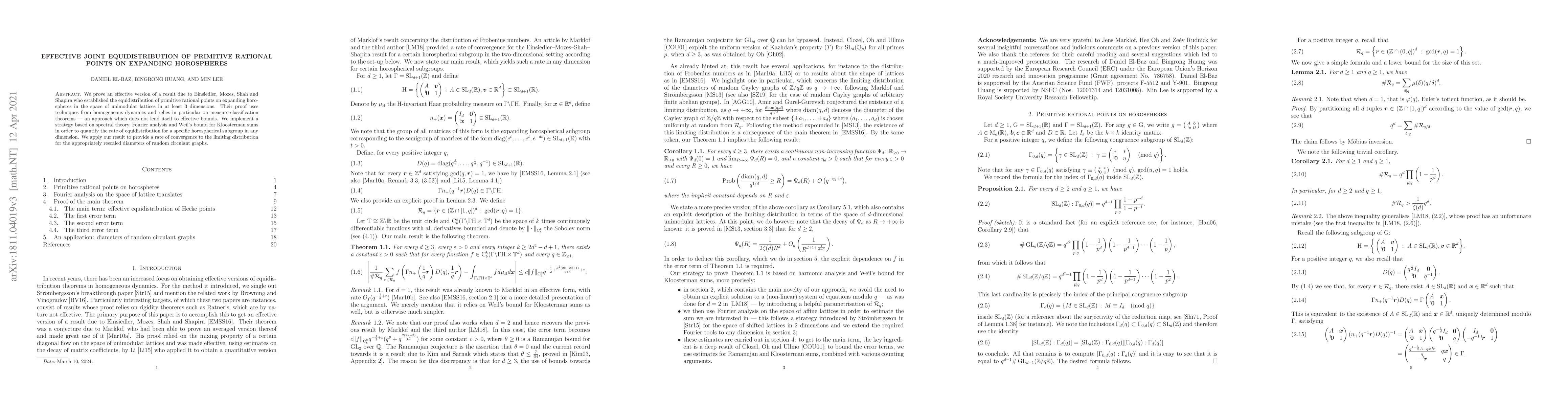 This paper proves an effective version of equidistribution for primitive rational points on expanding horospheres using spectral theory, Fourier analysis, and Weil's bound. It provides a quantifiable rate of convergence for the rescaled diameters of random circulant graphs.