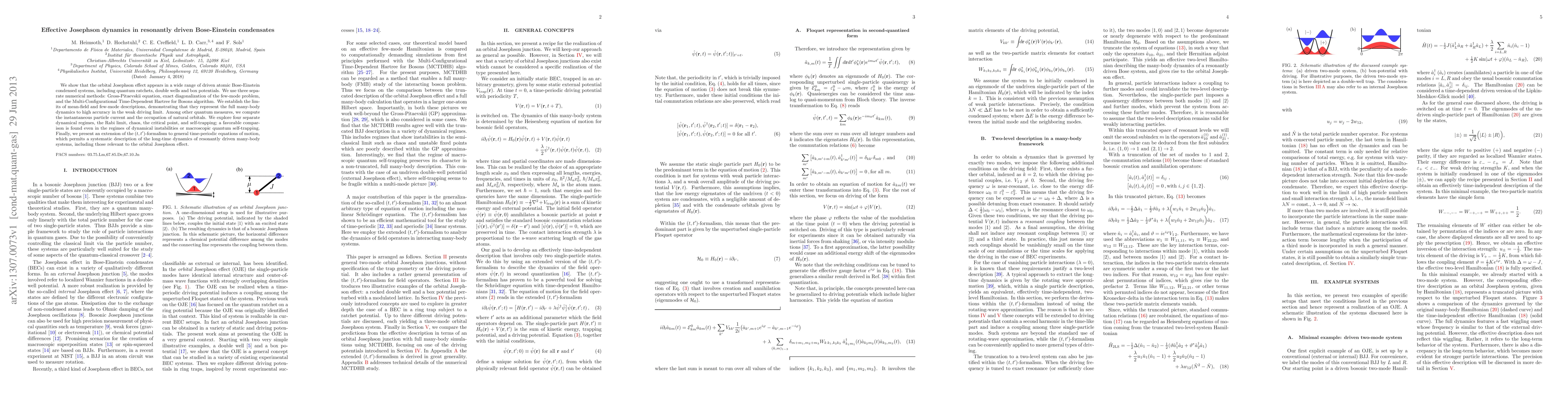 We show that the orbital Josephson effect appears in a wide range of driven atomic Bose-Einstein condensed systems, including quantum ratchets, double wells and box potentials. We use three separate numerical methods: Gross-Pitaevskii equation, exact diagonalization of the few-mode problem, and the Multi-Configurational Time-Dependent Hartree for Bosons algorithm. We establish the limits of mean-field and few-mode descriptions, demonstrating that they represent the full many-body dynamics to high accuracy in the weak driving limit. Among other quantum measures, we compute the instantaneous particle current and the occupation of natural orbitals. We explore four separate dynamical regimes, the Rabi limit, chaos, the critical point, and self-trapping; a favorable comparison is found even in the regimes of dynamical instabilities or macroscopic quantum self-trapping. Finally, we present an extension of the (t,t')-formalism to general time-periodic equations of motion, which permits a systematic description of the long-time dynamics of resonantly driven many-body systems, including those relevant to the orbital Josephson effect.