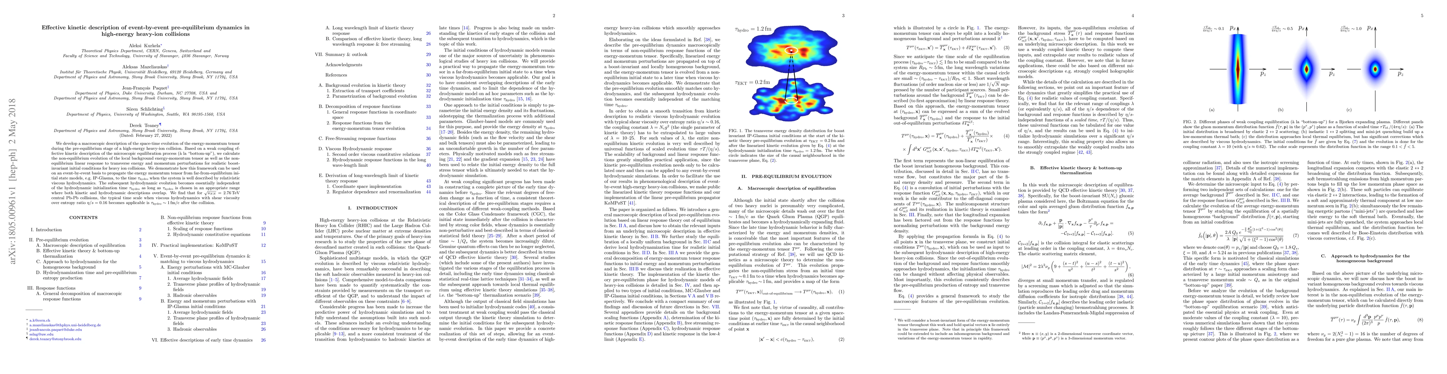 We develop a macroscopic description of the space-time evolution of the energy-momentum tensor during the pre-equilibrium stage of a high-energy heavy-ion collision. Based on a weak coupling effective kinetic description of the microscopic equilibration process (\`a la "bottom-up"), we calculate the non-equilibrium evolution of the local background energy-momentum tensor as well as the non-equilibrium linear response to transverse energy and momentum perturbations for realistic boost-invariant initial conditions for heavy ion collisions. We demonstrate how this framework can be used on an event-by-event basis to propagate the energy momentum tensor from far-from-equilibrium initial state models, e.g. IP-Glasma, to the time $\tau_\text{hydro}$ when the system is well described by relativistic viscous hydrodynamics. The subsequent hydrodynamic evolution becomes essentially independent of the hydrodynamic initialization time $\tau_\text{hydro}$ as long as $\tau_\text{hydro}$ is chosen in an appropriate range where both kinetic and hydrodynamic descriptions overlap. We find that for $\sqrt{s_{NN}}=2.76\,\text{TeV}$ central Pb-Pb collisions, the typical time scale when viscous hydrodynamics with shear viscosity over entropy ratio $\eta/s=0.16$ becomes applicable is $\tau_\text{hydro}\sim 1\,\text{fm/c}$ after the collision.