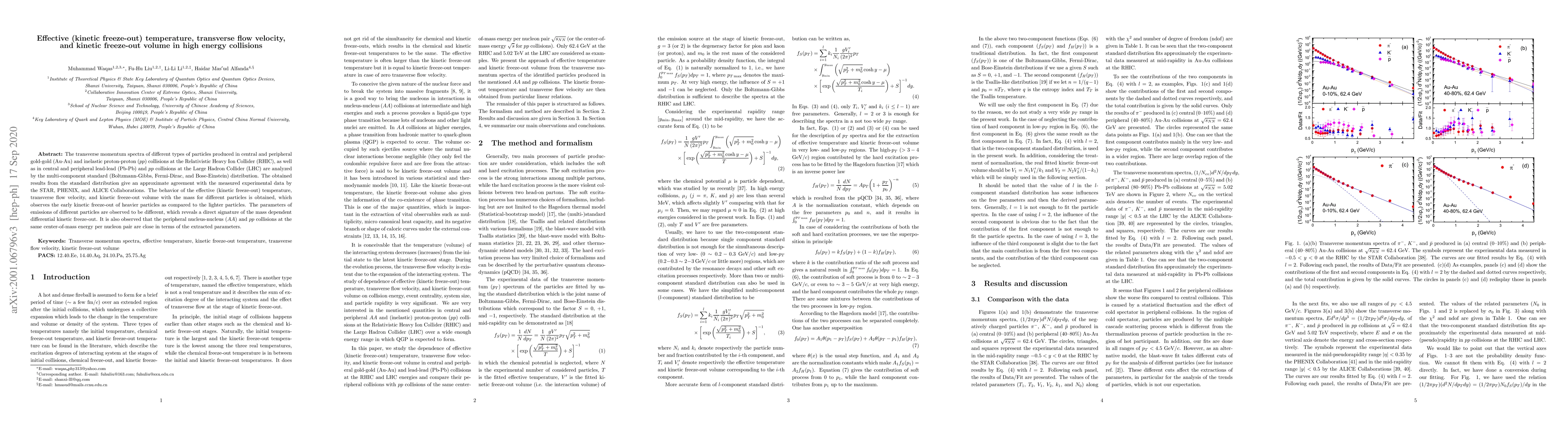 The transverse momentum spectra of different types of particles produced in central and peripheral gold-gold (Au-Au) and (inelastic) proton-proton ($pp$) collisions at the Relativistic Heavy Ion Collider (RHIC), as well as in central and peripheral lead-lead (Pb-Pb) and $pp$ collisions at the Large Hadron Collider (LHC) are analyzed by the standard distribution in terms of multi-component. The obtained results from the standard distribution give an approximate agreement with the measured experimental data by the STAR, PHENIX and ALICE Collaborations. The methodical behavior of the effective (kinetic freeze-out) temperature, transverse flow velocity and kinetic freeze-out volume with the mass dependence for different particles is obtained, which observes the early kinetic freeze-out of heavier particles as compared to the lighter particles. The parameters for emissions of different particles are observed to be different, which reveals a direct signature of the mass dependent differential kinetic freeze-out. It is also observed that the peripheral nucleus-nucleus ($AA$) and $pp$ collisions at the same center-of-mass energy per nucleon pair are close in terms of the extracted parameters.