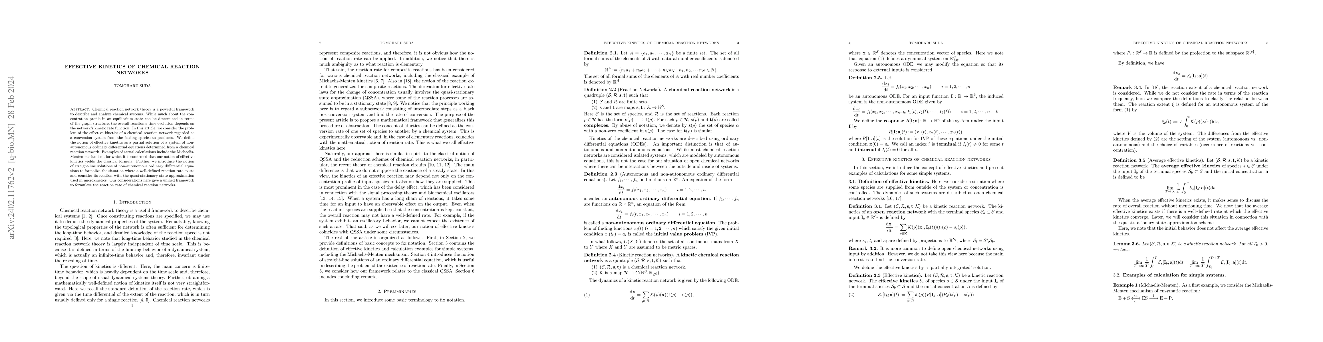 This paper develops a framework for effective kinetics in chemical reaction networks, defining it as a partial solution of non-autonomous ordinary differential equations derived from the network's structure. It applies this concept to the Michaelis-Menten mechanism and introduces straight-line solutions to formalize situations with well-defined reaction rates, providing a unified approach to reaction rate formulation.