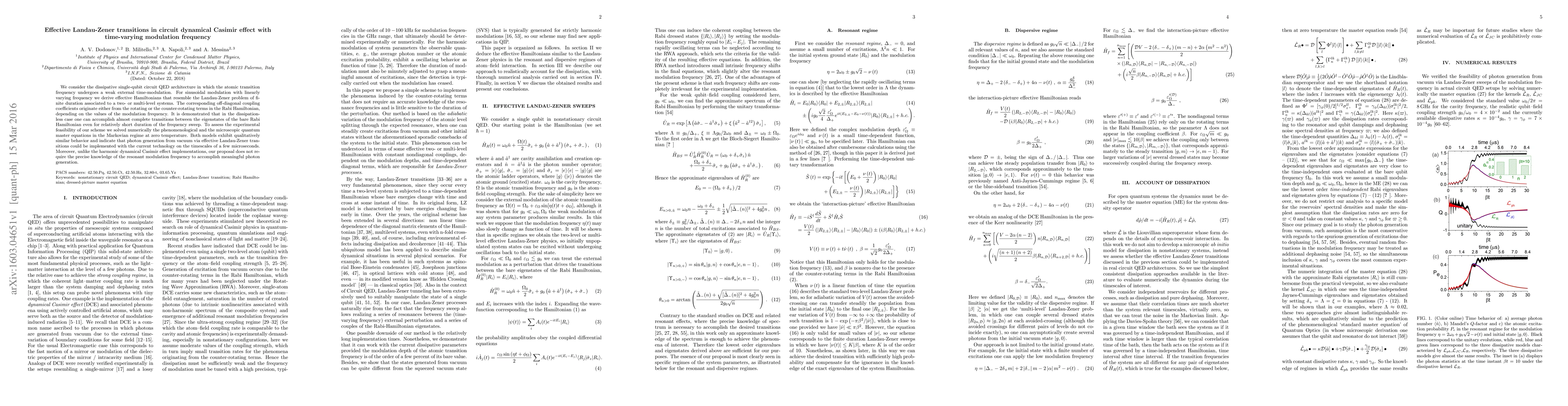 We consider the dissipative single-qubit circuit QED architecture in which the atomic transition frequency undergoes a weak external time-modulation. For sinusoidal modulation with linearly varying frequency we derive effective Hamiltonians that resemble the Landau-Zener problem of finite duration associated to a two- or multi-level systems. The corresponding off-diagonal coupling coefficients originate either from the rotating or the counter-rotating terms in the Rabi Hamiltonian, depending on the values of the modulation frequency. It is demonstrated that in the dissipation less case one can accomplish almost complete transitions between the eigenstates of the bare Rabi Hamiltonian even for relatively short duration of the frequency sweep. To assess the experimental feasibility of our scheme we solved numerically the phenomenological and the microscopic quantum master equations in the Markovian regime at zero temperature. Both models exhibit qualitatively similar behavior and indicate that photon generation from vacuum via effective Landau-Zener transitions could be implemented with the current technology on the timescales of a few microseconds. Moreover, unlike the harmonic dynamical Casimir effect implementations, our proposal does not require the precise knowledge of the resonant modulation frequency to accomplish meaningful photon generation.