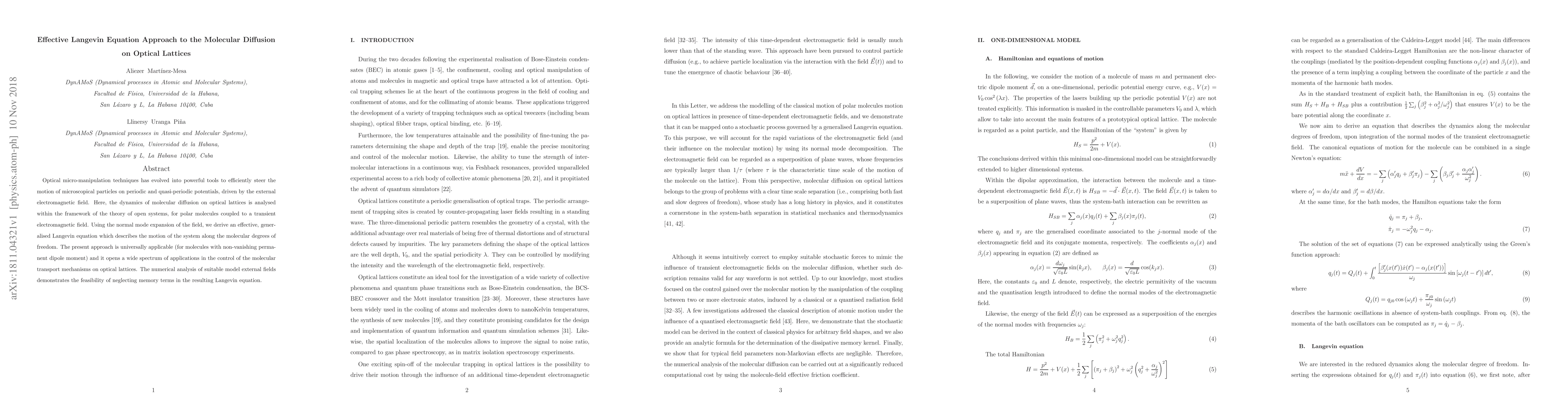 This paper develops an effective generalised Langevin equation for molecular diffusion on optical lattices, using open system theory and normal mode expansion. The approach is universally applicable to polar molecules and demonstrates the feasibility of simplifying the equation by neglecting memory terms.