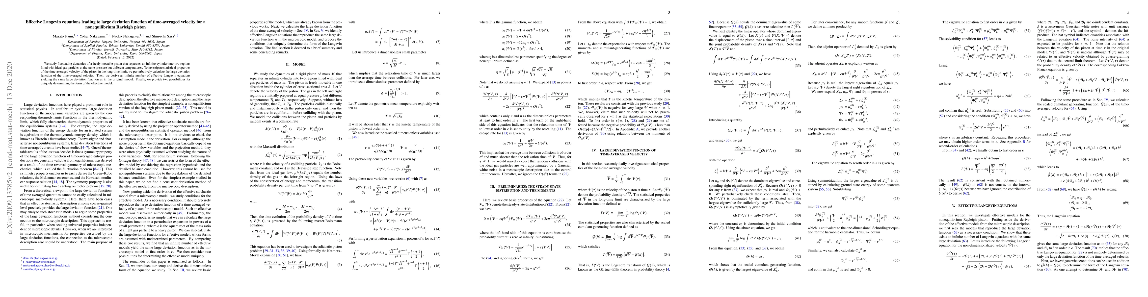We study fluctuating dynamics of a freely movable piston that separates an infinite cylinder into two regions filled with ideal gas particles at the same pressure but different temperatures. To investigate statistical properties of the time-averaged velocity of the piston in the long-time limit, we perturbatively calculate the large deviation function of the time-averaged velocity. Then, we derive an infinite number of effective Langevin equations yielding the same large deviation function as in the original model. Finally, we provide two possibilities for uniquely determining the form of the effective model.