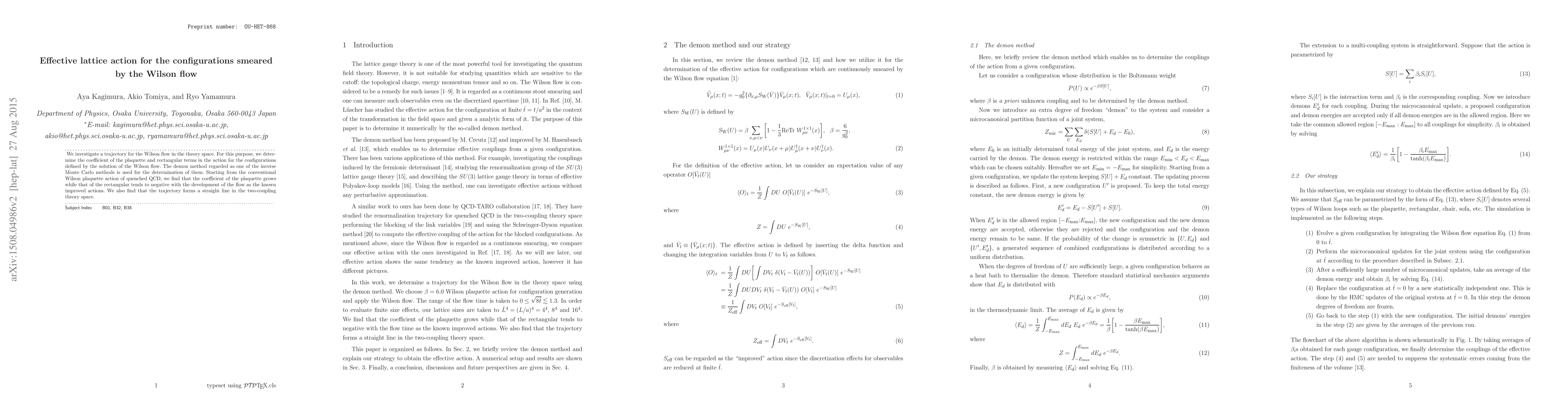 The paper explores a Wilson flow trajectory in theory space, determining optimal coefficients for plaquette and rectangular terms in quenched QCD action using the demon method. Results indicate the plaquette coefficient increases and rectangular coefficient decreases with flow development, forming a linear trajectory in a two-coupling theory space.