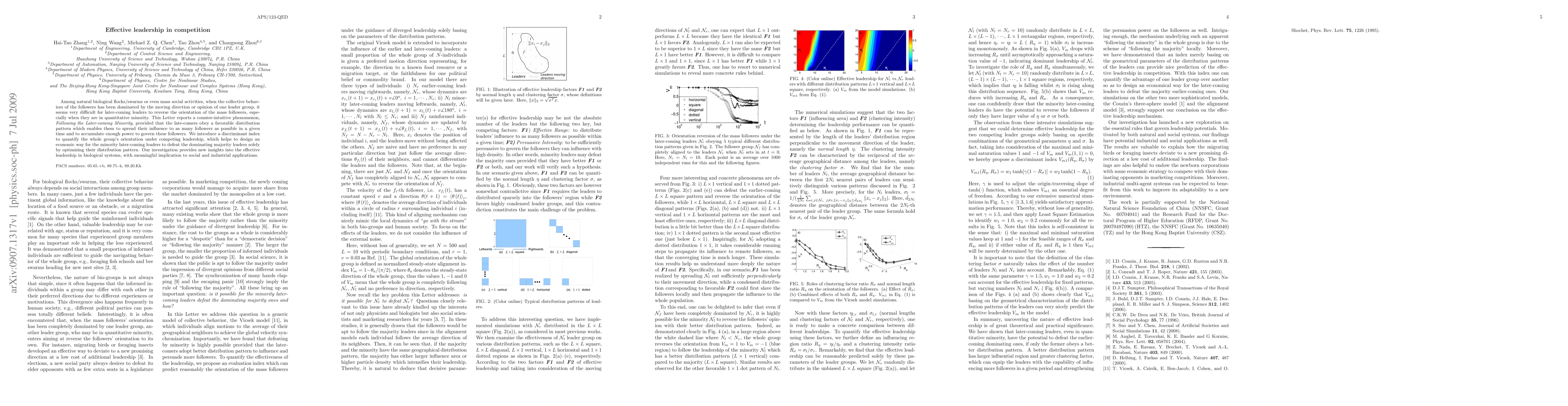 Among natural biological flocks/swarms or even mass social activities, when the collective behaviors of the followers has been dominated by the moving direction or opinion of one leader group, it seems very difficult for later-coming leaders to reverse the orientation of the mass followers, especially when they are in quantitative minority. This Letter reports a counter-intuitive phenomenon, Following the Later-coming Minority, provided that the late-comers obey a favorable distribution pattern which enables them to spread their influence to as many followers as possible in a given time and to accumulate enough power to govern these followers. We introduce a discriminant index to quantify the whole group's orientation under competing leadership, which helps to design an economic way for the minority later-coming leaders to defeat the dominating majority leaders solely by optimizing their distribution pattern. Our investigation provides new insights into the effective leadership in biological systems, with meaningful implication to social and industrial applications.