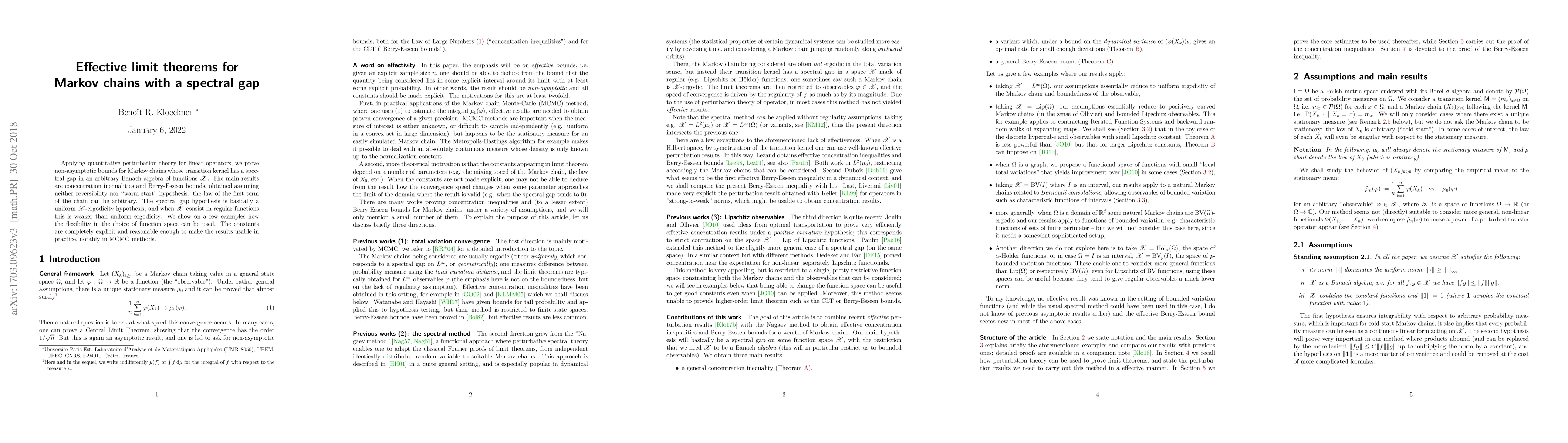 Applying quantitative perturbation theory for linear operators, we prove non-asymptotic limit theorems for Markov chains whose transition kernel has a spectral gap in an arbitrary Banach algebra of functions X . The main results are concentration inequalities and Berry-Esseen bounds, obtained assuming neither reversibility nor `warm start' hypothesis: the law of the first term of the chain can be arbitrary. The spectral gap hypothesis is basically a uniform X-ergodicity hypothesis, and when X consist in regular functions this is weaker than uniform ergodicity. We show on a few examples how the flexibility in the choice of function space can be used. The constants are completely explicit and reasonable enough to make the results usable in practice, notably in MCMC methods.v2: Introduction rewritten, Section 3 applying the main results to examples improved (uniformly ergodic chains and Bernoulli convolutions have been notably added) . Main results and their proofs are unchanged.