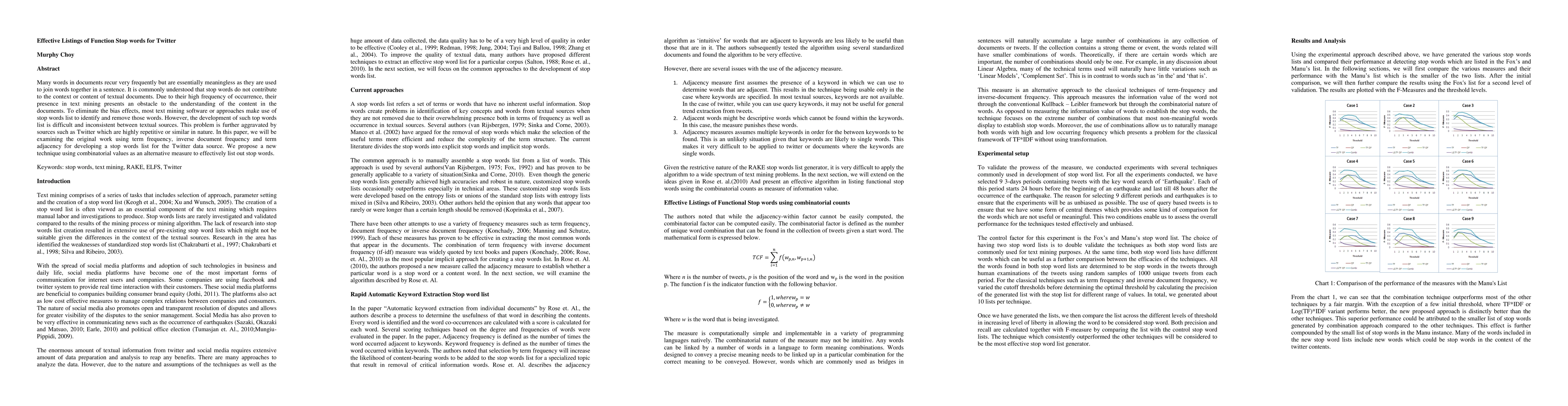 Many words in documents recur very frequently but are essentially meaningless as they are used to join words together in a sentence. It is commonly understood that stop words do not contribute to the context or content of textual documents. Due to their high frequency of occurrence, their presence in text mining presents an obstacle to the understanding of the content in the documents. To eliminate the bias effects, most text mining software or approaches make use of stop words list to identify and remove those words. However, the development of such top words list is difficult and inconsistent between textual sources. This problem is further aggravated by sources such as Twitter which are highly repetitive or similar in nature. In this paper, we will be examining the original work using term frequency, inverse document frequency and term adjacency for developing a stop words list for the Twitter data source. We propose a new technique using combinatorial values as an alternative measure to effectively list out stop words.