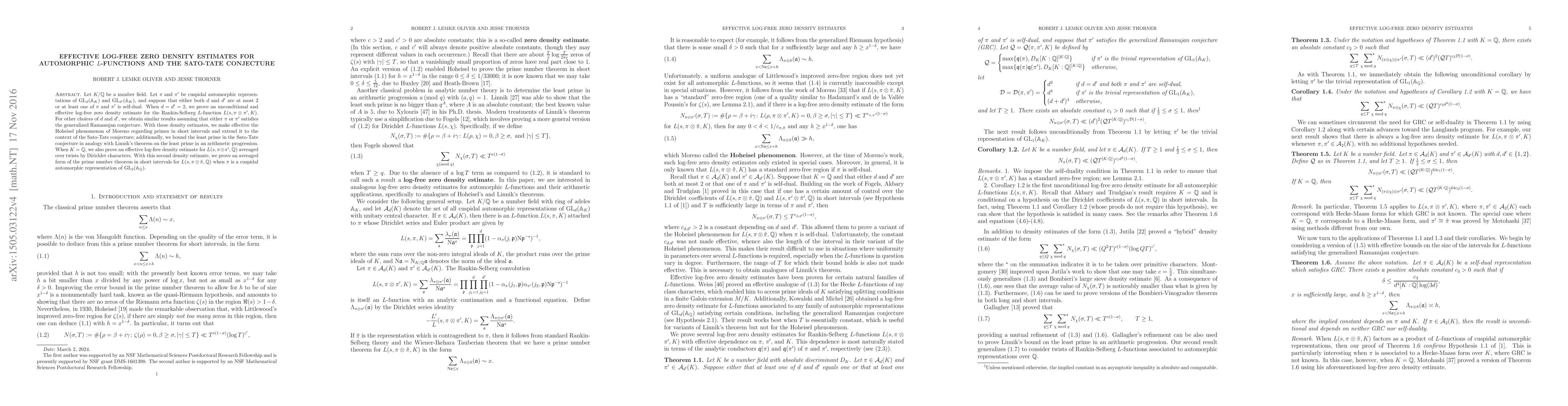 Researchers prove effective log-free zero density estimates for automorphic L-functions, extending the Sato-Tate conjecture and providing insights into prime number distribution in short intervals.