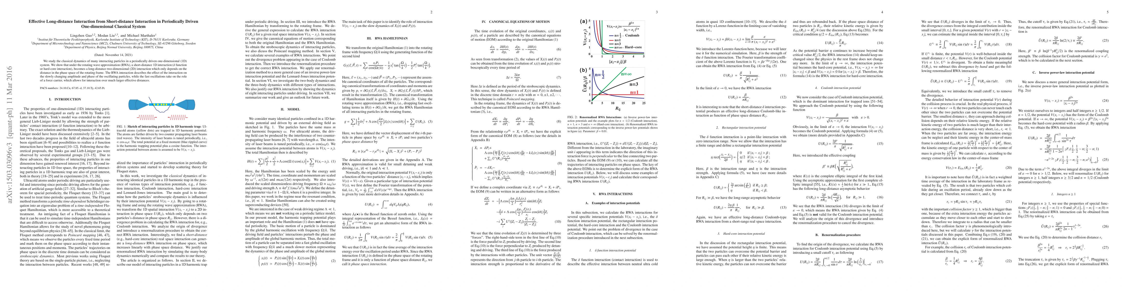 This paper investigates the classical dynamics of particles in a periodically driven one-dimensional system, demonstrating that short-distance interactions transform into long-distance two-dimensional interactions via the rotating wave approximation, enabling effective interaction over larger effective distances.