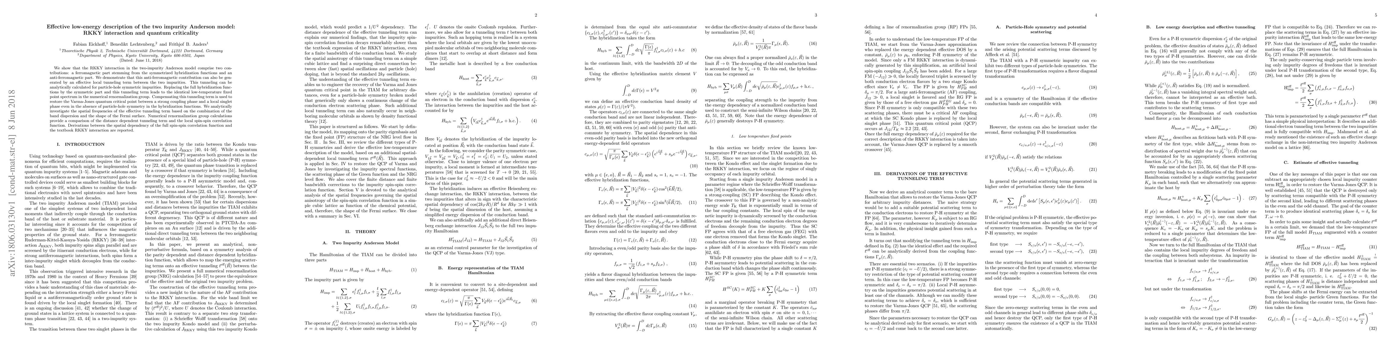 This research simplifies the low-energy description of the two impurity Anderson model by separating the RKKY interaction into ferromagnetic and anti-ferromagnetic parts. It introduces an effective local tunneling term to account for the anti-ferromagnetic contribution, analytically calculable for symmetric impurities. This approach preserves the numerical renormalization group's fixed point spectrum, enabling restoration of the quantum critical point without particle-hole symmetry in hybridization functions. The study also examines the spatial frequencies of the tunneling term using band dispersion and Fermi surface shape, supported by numerical renormalization group calculations.