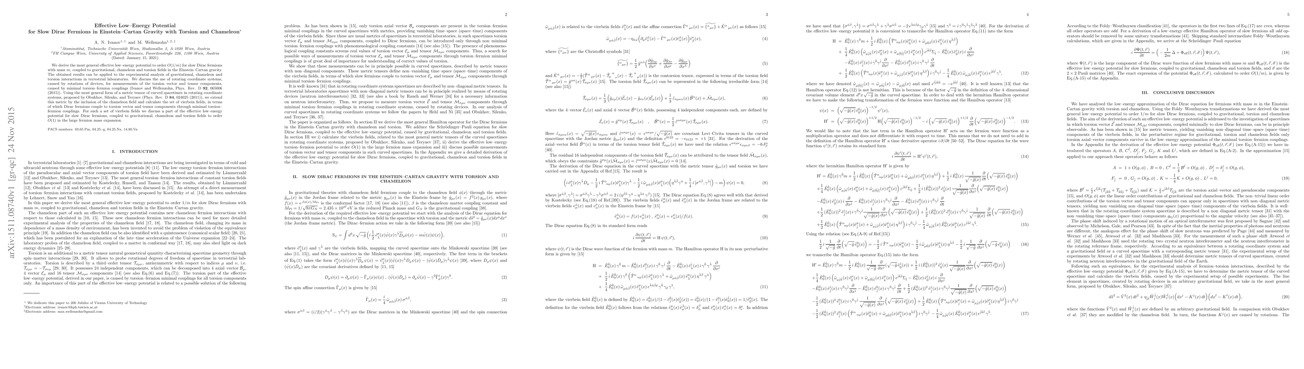 This paper derives the effective low-energy potential for slow Dirac fermions interacting with gravitational, chameleon, and torsion fields in Einstein-Cartan gravity. The results are applicable for experimental analysis in terrestrial laboratories, particularly for measuring torsion interactions in rotating systems.