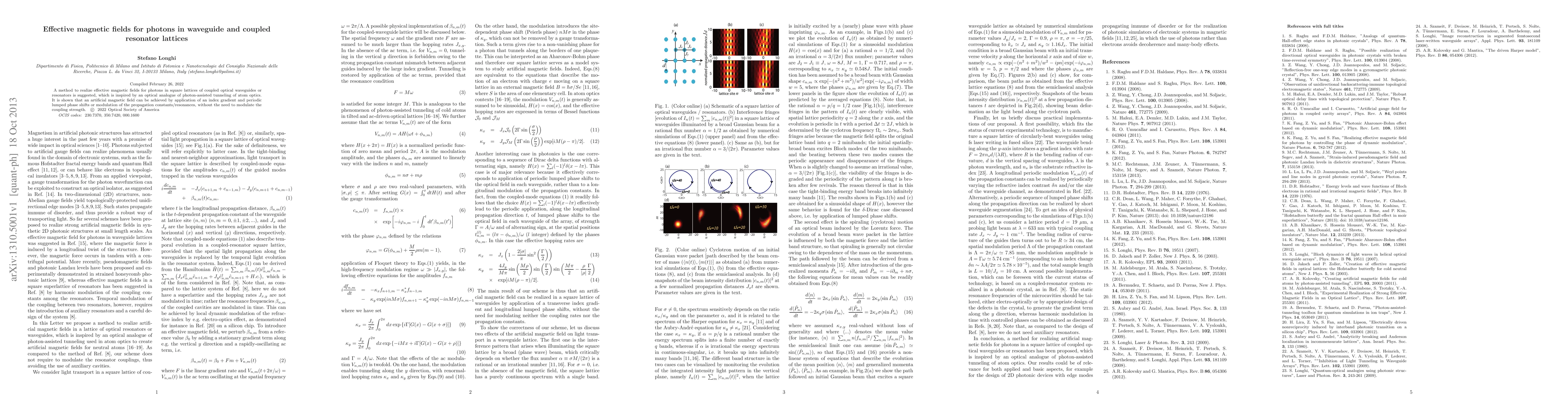 A method to realize effective magnetic fields for photons in square lattices of coupled optical waveguides or resonators is suggested, which is inspired by an optical analogue of photon-assisted tunneling of atom optics. It is shown that an artificial magnetic field can be achieved by application of an index gradient and periodic lumped phase shifts or modulation of the propagation constants/resonances, without the need to modulate the coupling strength.