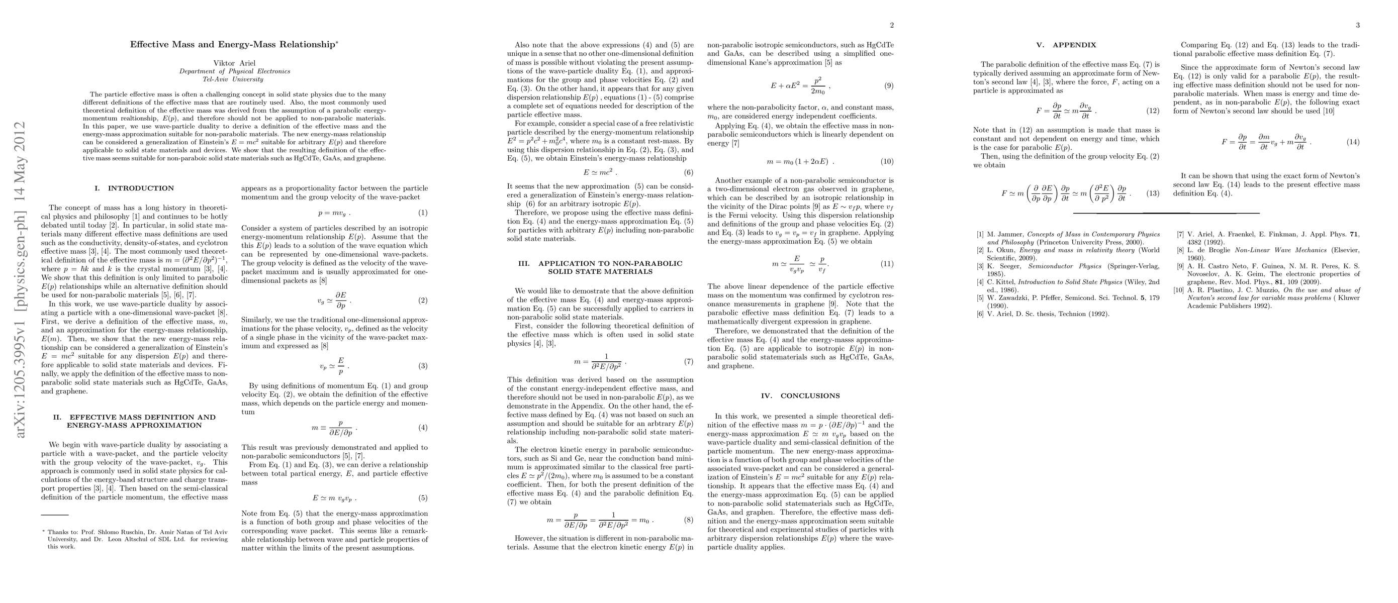 The particle effective mass is often a challenging concept in solid state physics due to the many different definitions of the effective mass that are routinely used. Also, the most commonly used theoretical definition of the effective mass was derived from the assumption of a parabolic energy-momentum relationship, E(p), and therefore should not be applied to non-parabolic materials. In this paper, we use wave-particle duality to derive a definition of the effective mass and the energy-mass approximation suitable for non-parabolic materials. The new energy-mass relationship can be considered a generalization of Einstein's E=mc^2 suitable for arbitrary E(p) and therefore applicable to solid state materials and devices. We show that the resulting definition of the effective mass seems suitable for non-paraboic solid state materials such as HgCdTe, GaAs, and graphene.
