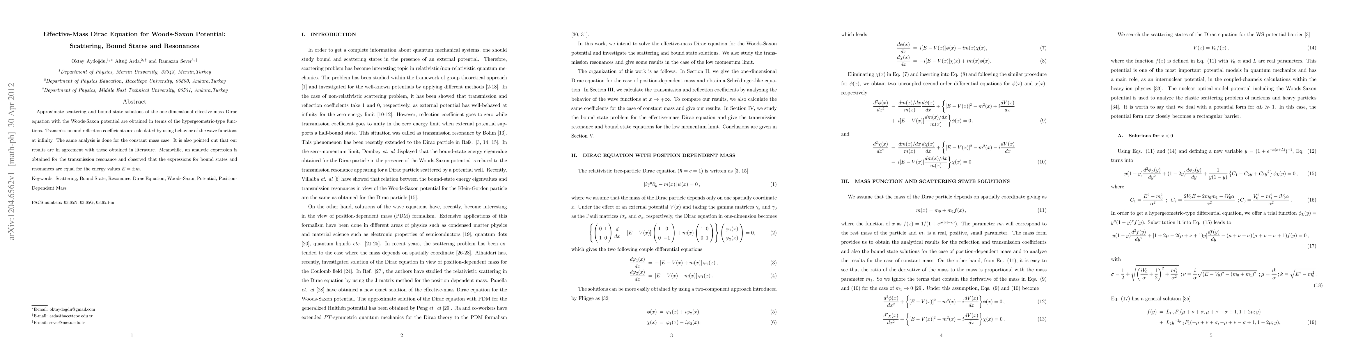 This paper explores the effective-mass Dirac equation with a Woods-Saxon potential, deriving scattering and bound state solutions using hypergeometric functions. It calculates transmission and reflection coefficients and finds agreement with existing literature, noting that bound states and resonances coincide at $E=\pm m$.