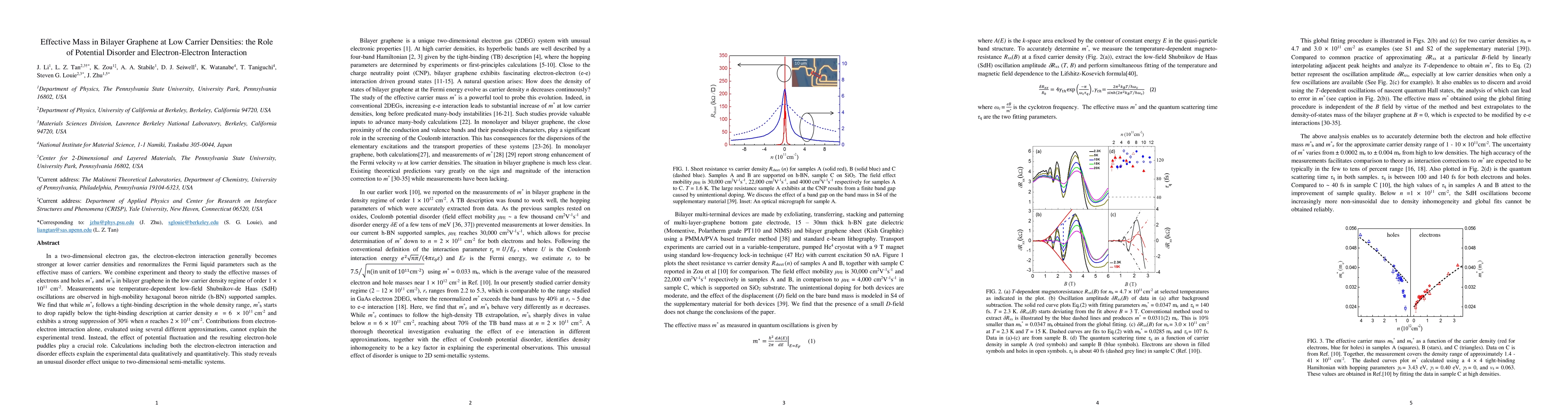 In a two-dimensional electron gas, the electron-electron interaction generally becomes stronger at lower carrier densities and renormalizes the Fermi liquid parameters such as the effective mass of carriers. We combine experiment and theory to study the effective masses of electrons and holes $m^*_e$ and $m^*_h$ in bilayer graphene in the low carrier density regime of order 1 * 10^11 cm^-2. Measurements use temperature-dependent low-field Shubnikov-de Haas (SdH) oscillations are observed in high-mobility hexagonal boron nitride (h-BN) supported samples. We find that while $m^*_e$ follows a tight-binding description in the whole density range, $m^*_h$ starts to drop rapidly below the tight-binding description at carrier density n = 6 * 10^11 cm^-2 and exhibits a strong suppression of 30% when n reaches 2 * 10^11 cm^-2. Contributions from electron-electron interaction alone, evaluated using several different approximations, cannot explain the experimental trend. Instead, the effect of potential fluctuation and the resulting electron-hole puddles play a crucial role. Calculations including both the electron-electron interaction and disorder effects explain the experimental data qualitatively and quantitatively. This study reveals an unusual disorder effect unique to two-dimensional semi-metallic systems.
