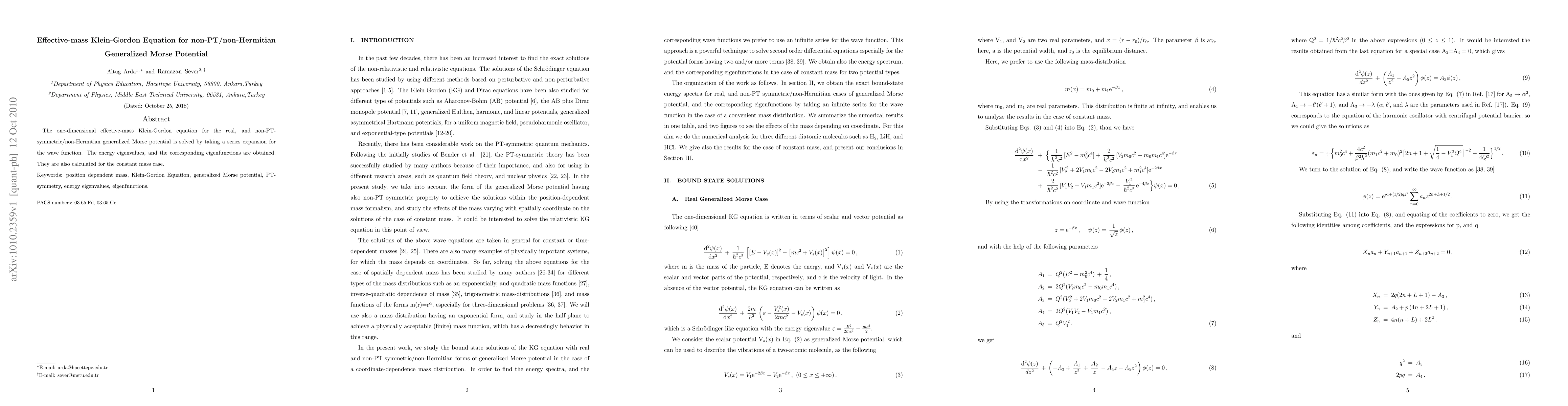 This paper solves the effective-mass Klein-Gordon equation for a non-PT-symmetric/non-Hermitian generalized Morse potential using a series expansion for the wave function. It derives energy eigenvalues and eigenfunctions, including results for the constant mass scenario.