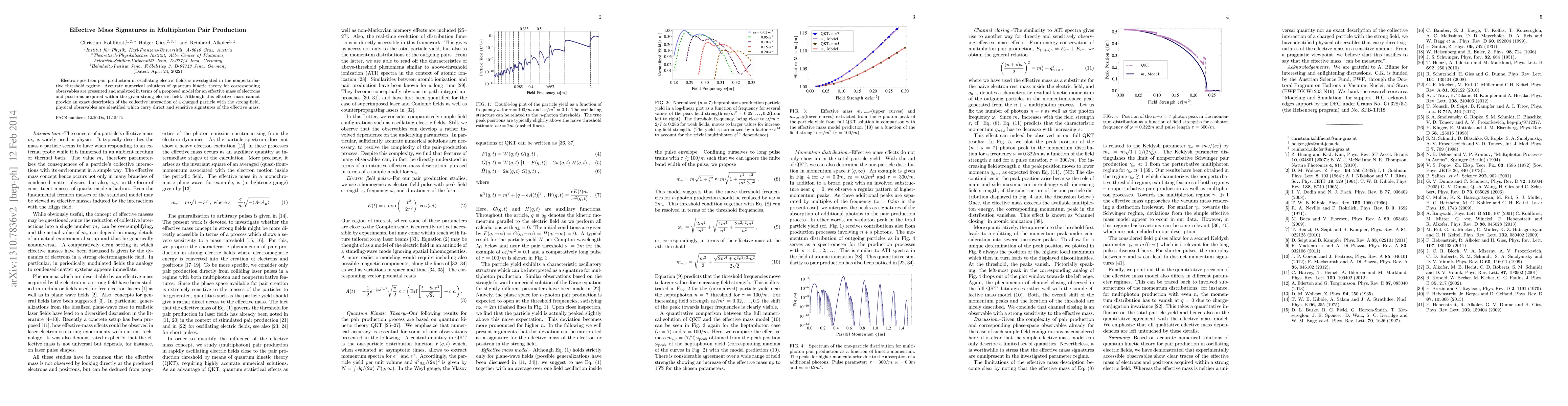 Electron-positron pair production in oscillating electric fields is investigated in the nonperturbative threshold regime. Accurate numerical solutions of quantum kinetic theory for corresponding observables are presented and analyzed in terms of a proposed model for an effective mass of electrons and positrons acquired within the given strong electric field. Although this effective mass cannot provide an exact description of the collective interaction of a charged particle with the strong field, physical observables are identified which carry direct and sensitive signatures of the effective mass.