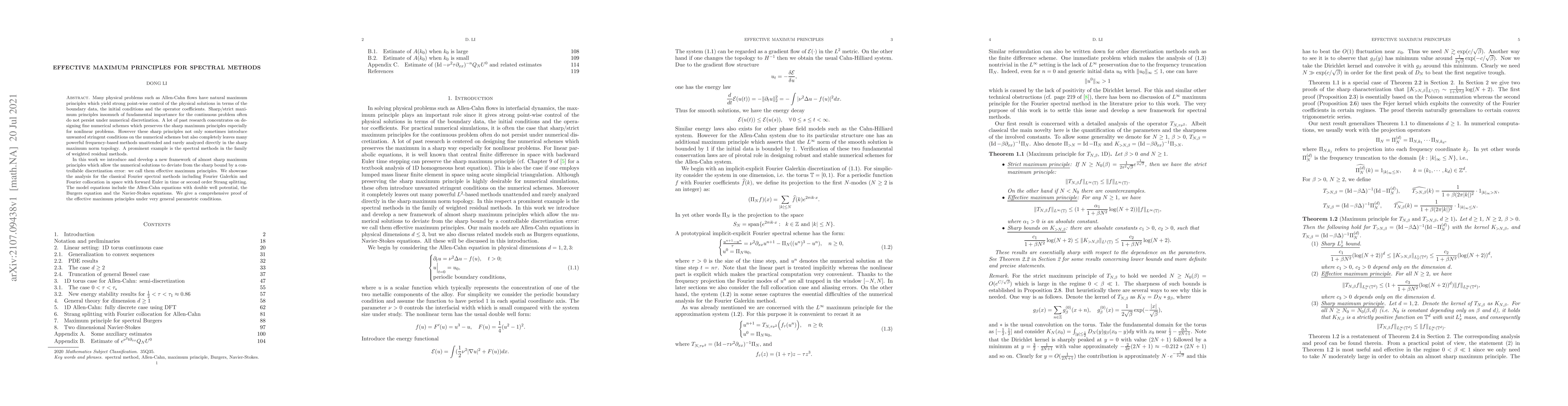 This paper develops a new framework of "effective maximum principles" to analyze spectral methods, ensuring strong point-wise control of numerical solutions while allowing for controllable discretization errors. The framework is demonstrated through classical Fourier spectral methods applied to Allen-Cahn, Burgers, and Navier-Stokes equations.