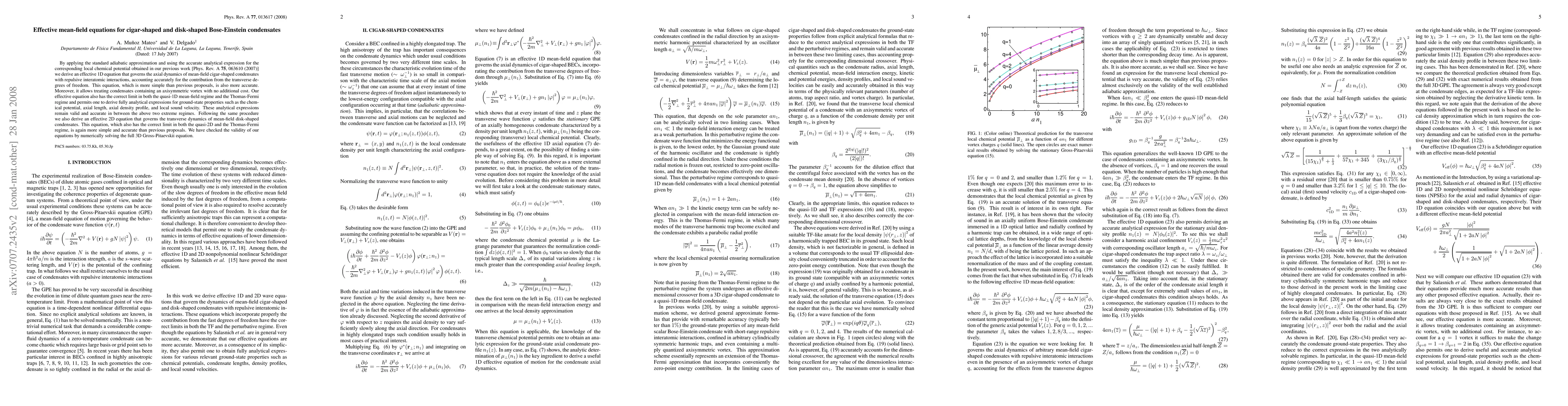 By applying the standard adiabatic approximation and using the accurate analytical expression for the corresponding local chemical potential obtained in our previous work [Phys. Rev. A \textbf{75}, 063610 (2007)] we derive an effective 1D equation that governs the axial dynamics of mean-field cigar-shaped condensates with repulsive interatomic interactions, accounting accurately for the contribution from the transverse degrees of freedom. This equation, which is more simple than previous proposals, is also more accurate. Moreover, it allows treating condensates containing an axisymmetric vortex with no additional cost. Our effective equation also has the correct limit in both the quasi-1D mean-field regime and the Thomas-Fermi regime and permits one to derive fully analytical expressions for ground-state properties such as the chemical potential, axial length, axial density profile, and local sound velocity. These analytical expressions remain valid and accurate in between the above two extreme regimes. Following the same procedure we also derive an effective 2D equation that governs the transverse dynamics of mean-field disk-shaped condensates. This equation, which also has the correct limit in both the quasi-2D and the Thomas-Fermi regime, is again more simple and accurate than previous proposals. We have checked the validity of our equations by numerically solving the full 3D Gross-Pitaevskii equation.