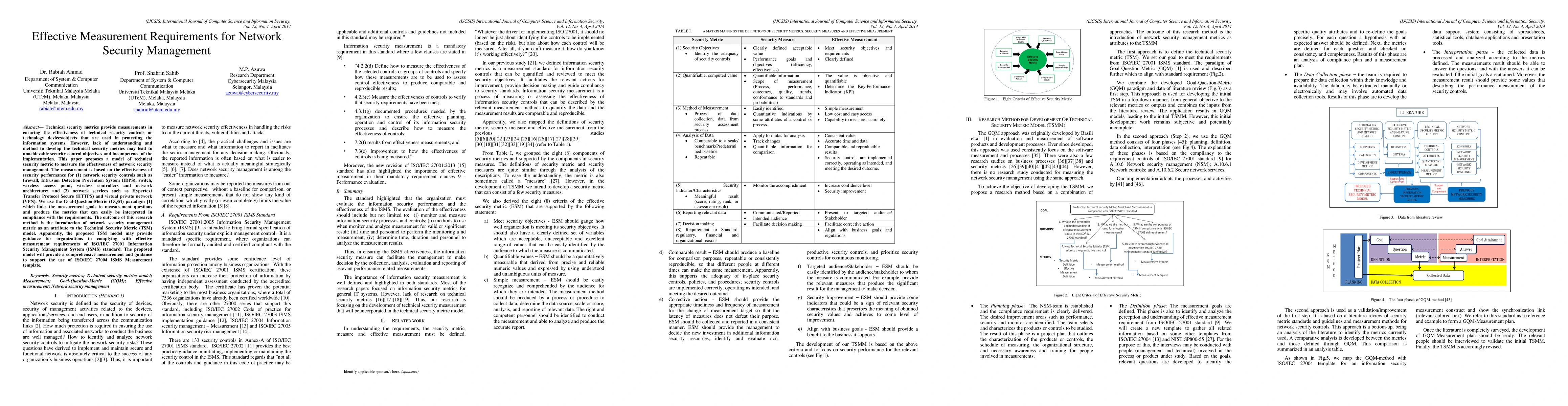 This paper proposes a Technical Security Metric (TSM) model to measure the effectiveness of network security management, focusing on controls and services. It uses the Goal-Question-Metric (GQM) paradigm to link measurement goals to metrics, aiming to guide organizations in complying with ISO/IEC 27001 and 27004 standards.