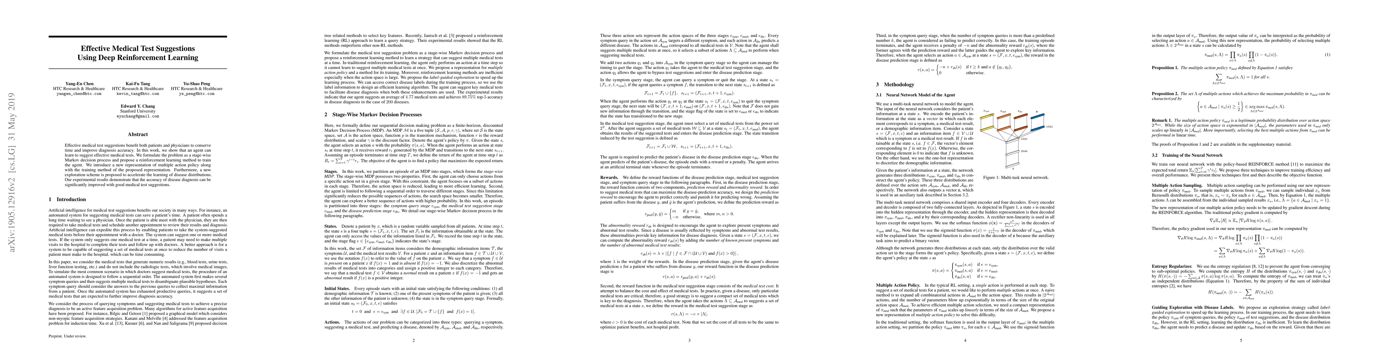 This paper proposes a deep reinforcement learning method to suggest effective medical tests, formulated as a stage-wise Markov decision process. The approach includes a new representation of multiple action policies and an exploration scheme to enhance learning, resulting in significantly improved diagnosis accuracy.