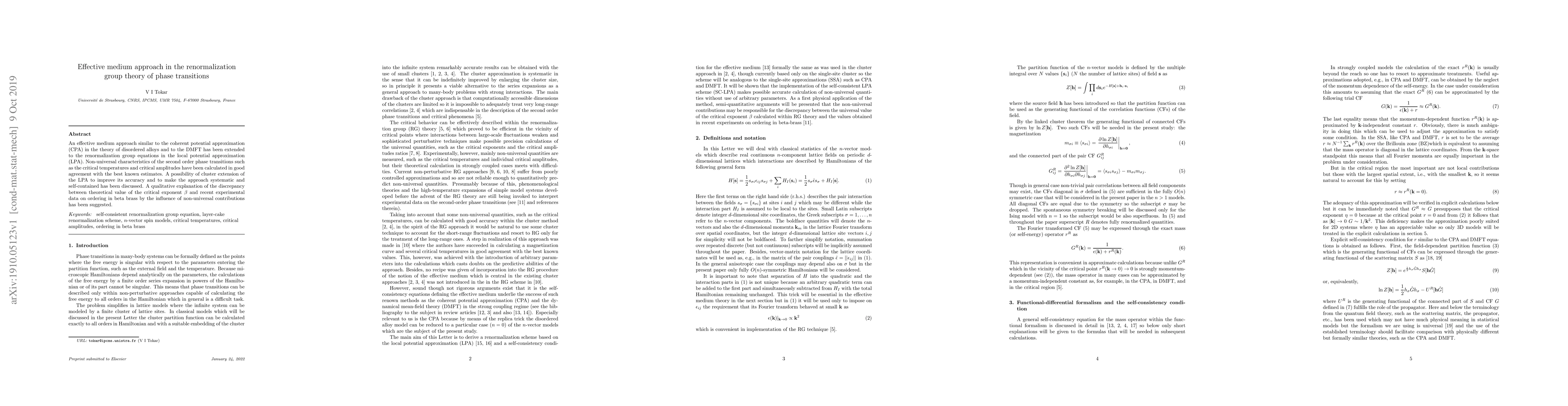 This paper extends the effective medium approach to renormalization group theory, achieving good agreement with known estimates for non-universal characteristics of second-order phase transitions. It also discusses potential cluster extensions to improve the local potential approximation and offers a qualitative explanation for discrepancies in critical exponents.