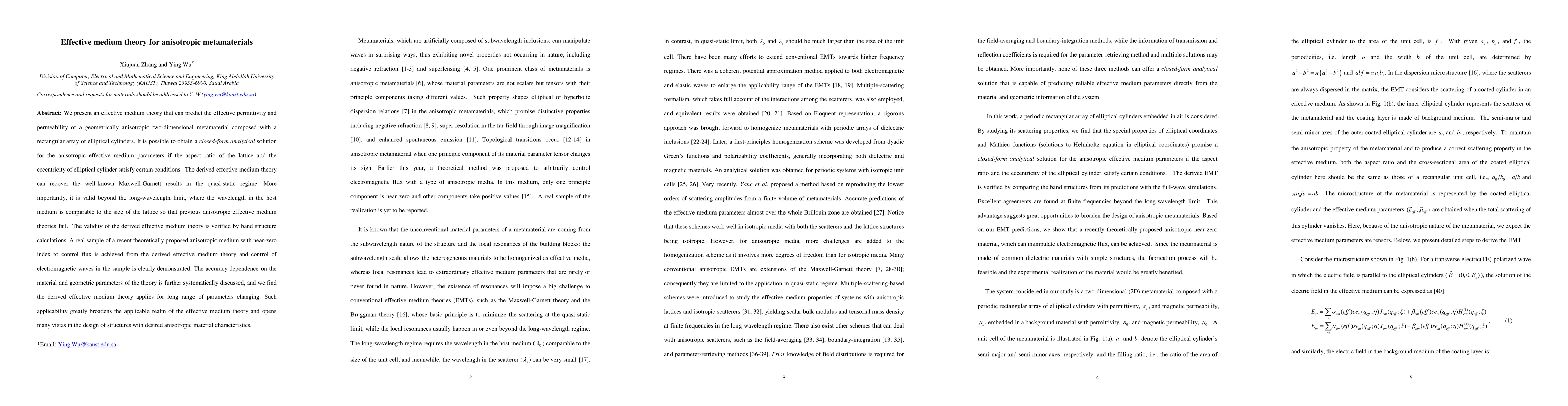 This paper develops an effective medium theory for anisotropic two-dimensional metamaterials, providing a closed-form analytical solution for effective permittivity and permeability under specific conditions. The theory extends beyond the long-wavelength limit and accurately predicts electromagnetic wave control in anisotropic media, broadening its applicability for designing advanced material structures.