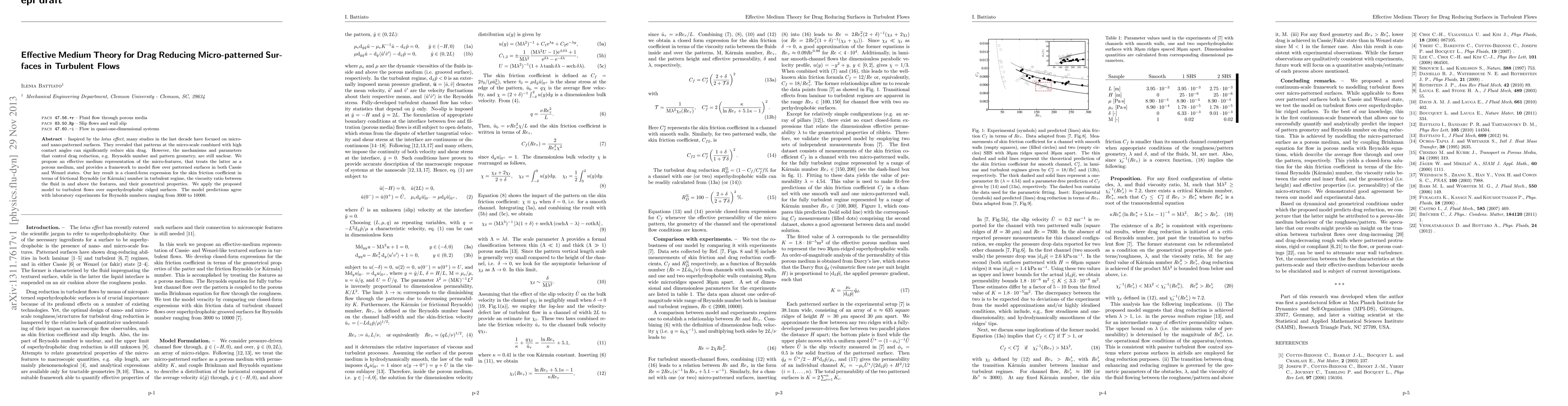 This paper proposes an effective medium theory to model drag reduction on micro-patterned surfaces in turbulent flows, providing a closed-form expression for the skin friction coefficient based on geometrical properties and fluid viscosity ratio. The model's predictions match experimental results for Reynolds numbers between 3000 and 10000.