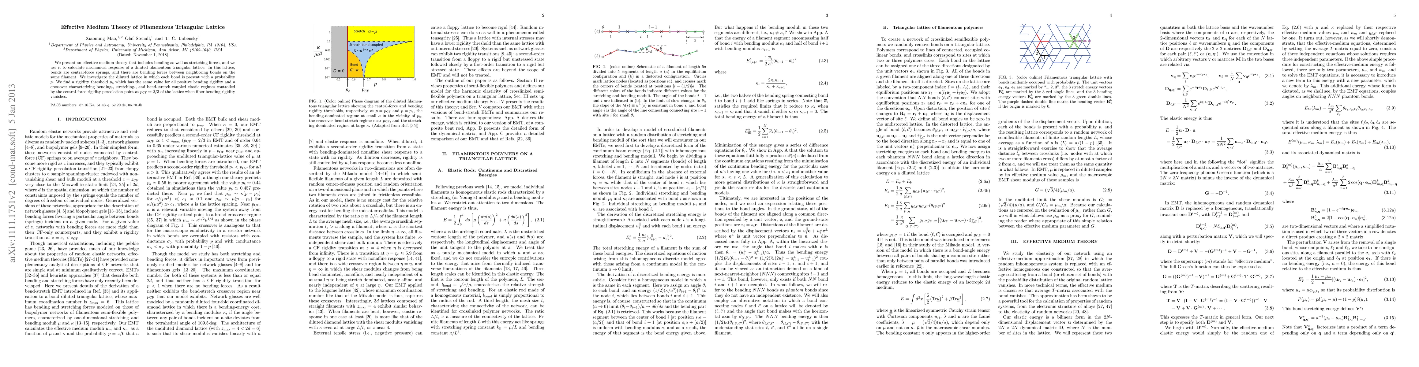 We present an effective medium theory that includes bending as well as stretching forces, and we use it to calculate mechanical response of a diluted filamentous triangular lattice. In this lattice, bonds are central-force springs, and there are bending forces between neighboring bonds on the same filament. We investigate the diluted lattice in which each bond is present with a probability $p$. We find a rigidity threshold $p_b$ which has the same value for all positive bending rigidity and a crossover characterizing bending-, stretching-, and bend-stretch coupled elastic regimes controlled by the central-force rigidity percolation point at $p_{\textrm{CF}} \simeq 2/3$ of the lattice when fiber bending rigidity vanishes.