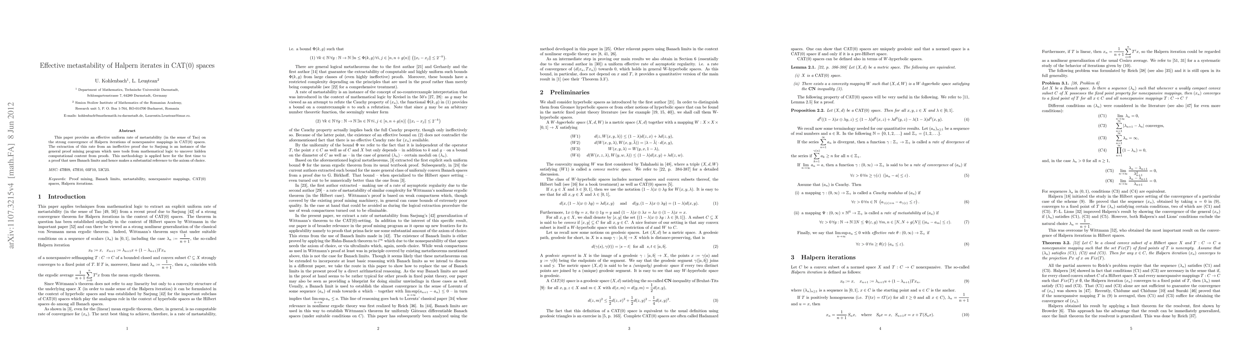 This paper provides an effective uniform rate of metastability (in the sense of Tao) on the strong convergence of Halpern iterations of nonexpansive mappings in CAT(0) spaces. The extraction of this rate from an ineffective proof due to Saejung is an instance of the general proof mining program which uses tools from mathematical logic to uncover hidden computational content from proofs. This methodology is applied here for the first time to a proof that uses Banach limits and hence makes a substantial reference to the axiom of choice.