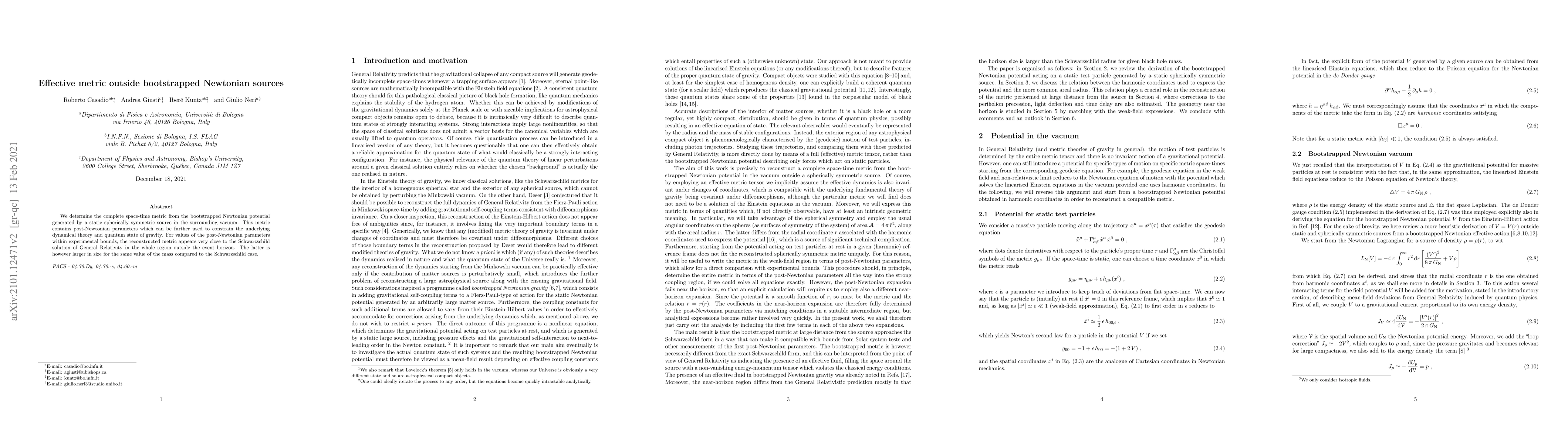 This paper reconstructs the complete space-time metric from a bootstrapped Newtonian potential around a static spherically symmetric source, finding it closely resembles the Schwarzschild solution for General Relativity within experimental bounds, though the event horizon is larger.